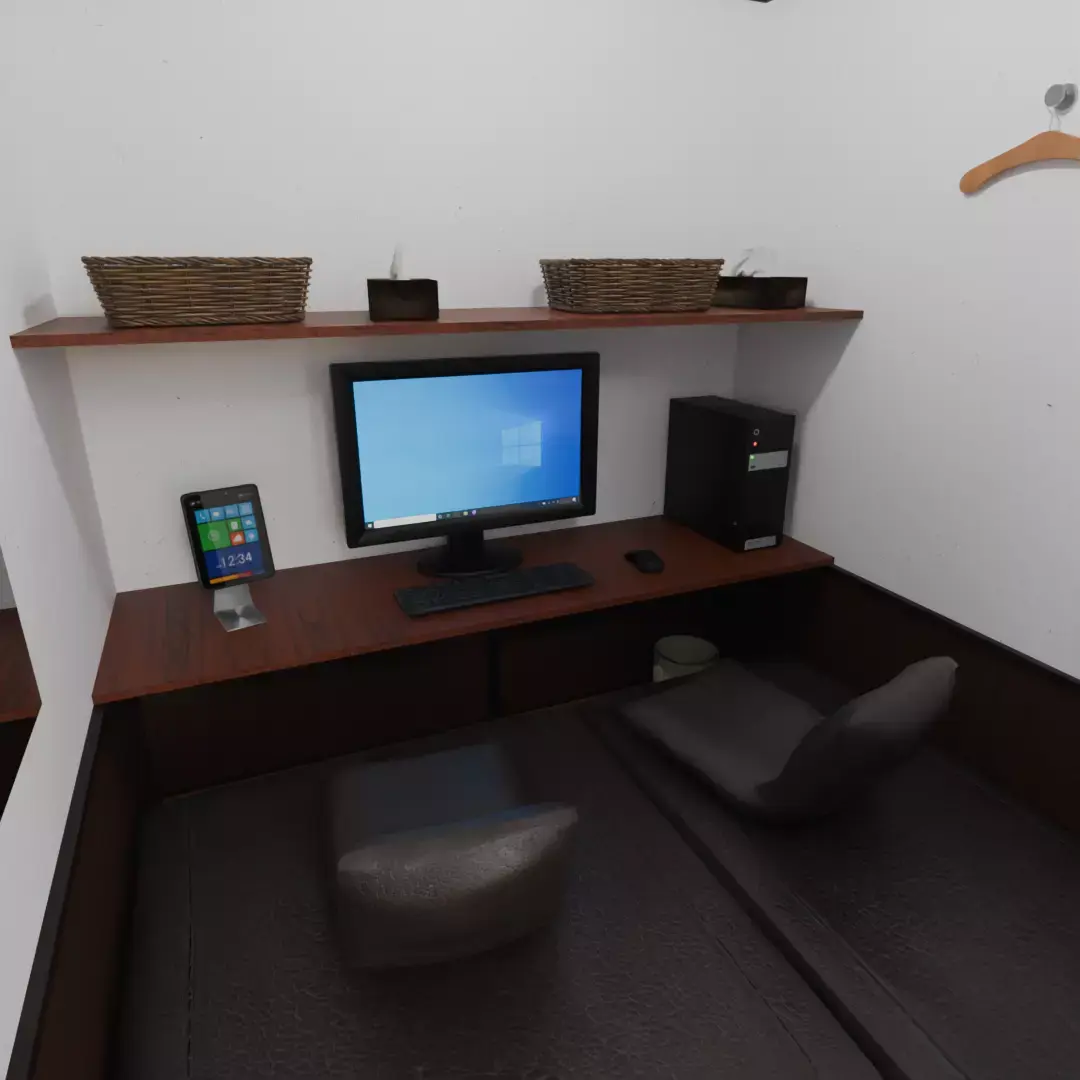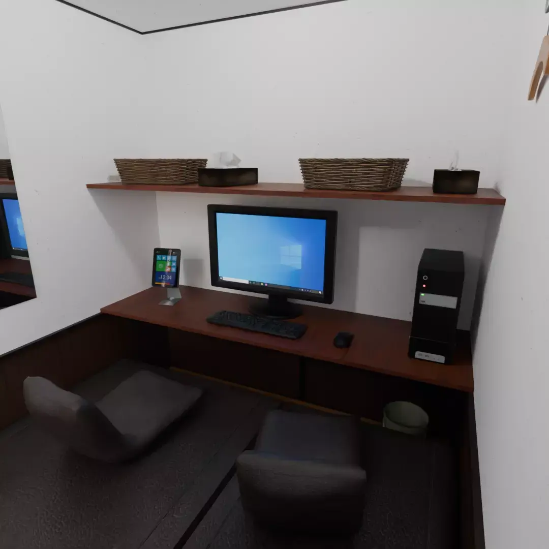 “A realistic internet cafe space where two people can spend time together”Simply placing it in the background will add a sense of realism and everyday life to your work.