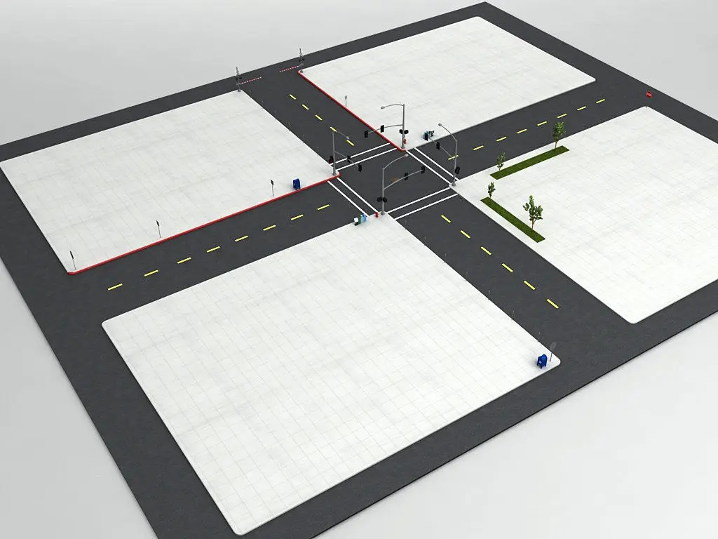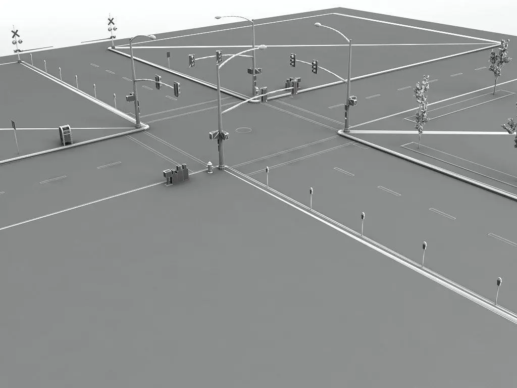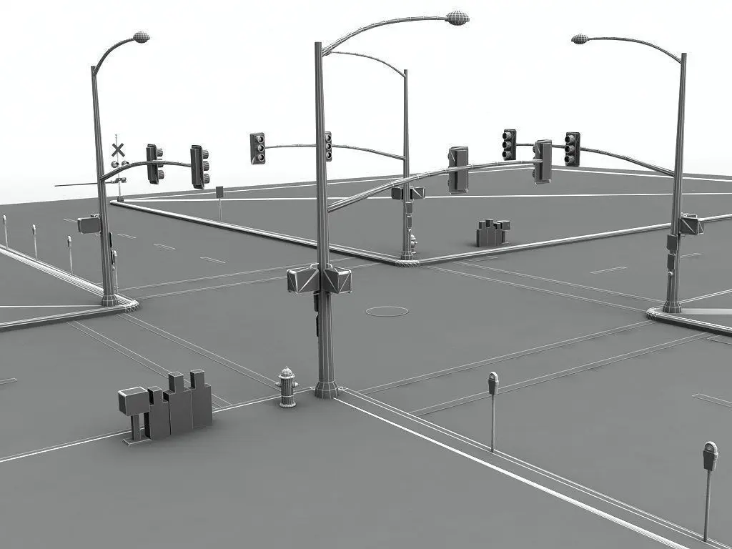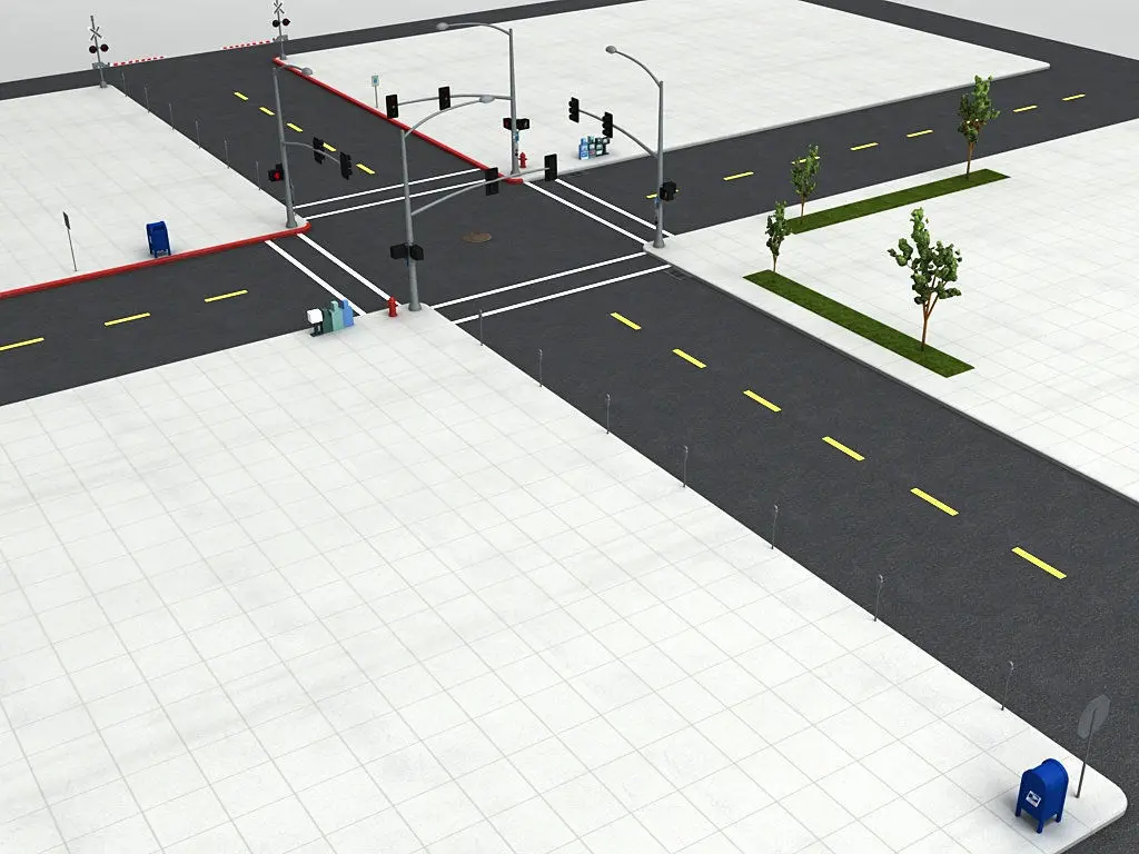 Intersection, streets, sidewalks, traffic lights, parking meters, trees etc.