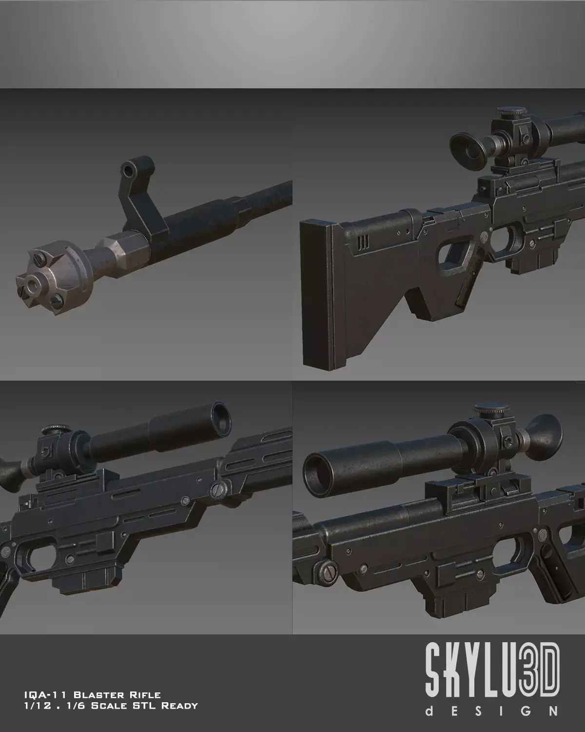 The IQA-11 long-range blaster rifle is sculpted in both 1/12 and 1/6 scale for figure customs and props. Designed in sections with a keyed setup, this rifle is 3D print-friendly, allowing for strong assembly and smooth handling. Ideal for Black Series or sixth scale display builds.