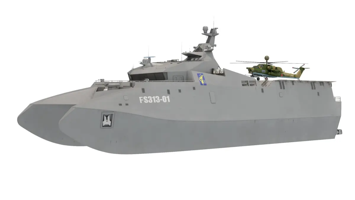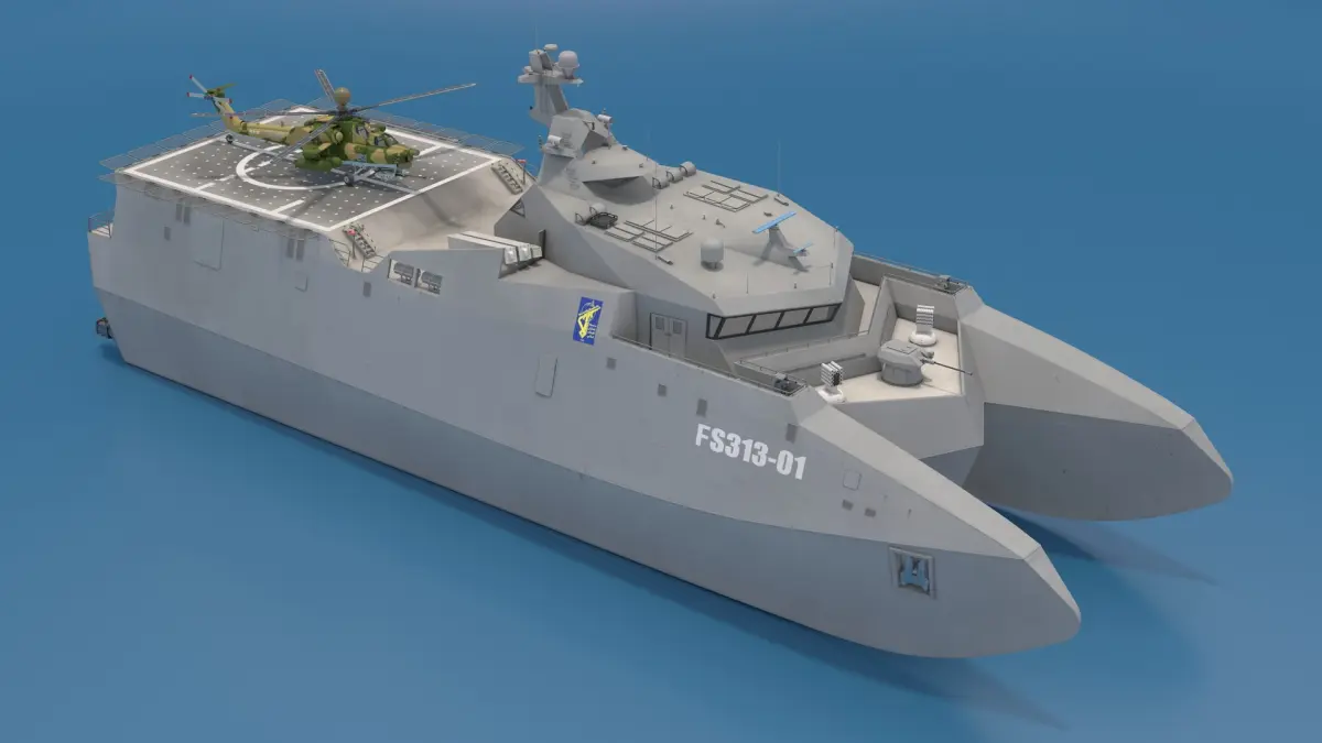 Iranian Corvette Shahid Soleimani with Combat Helicopter is a 3d model of a state-of-the-art military catamaran equipped for helicopter transport and operations.