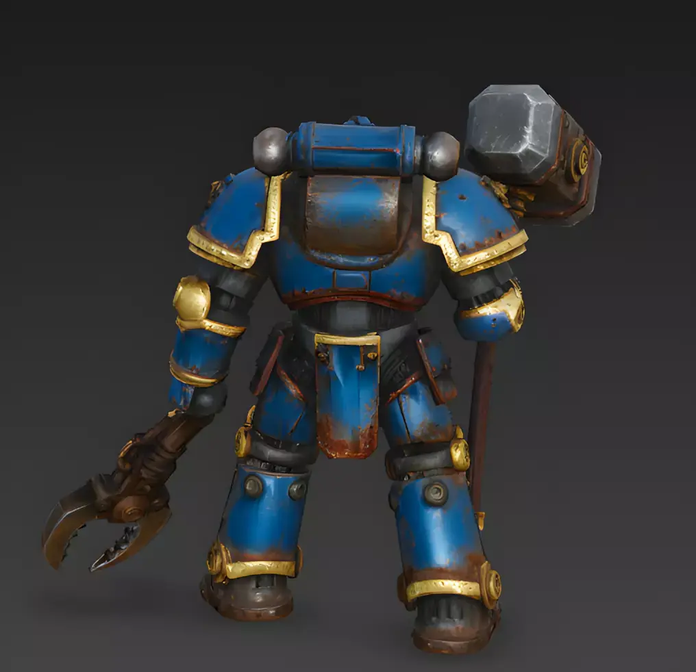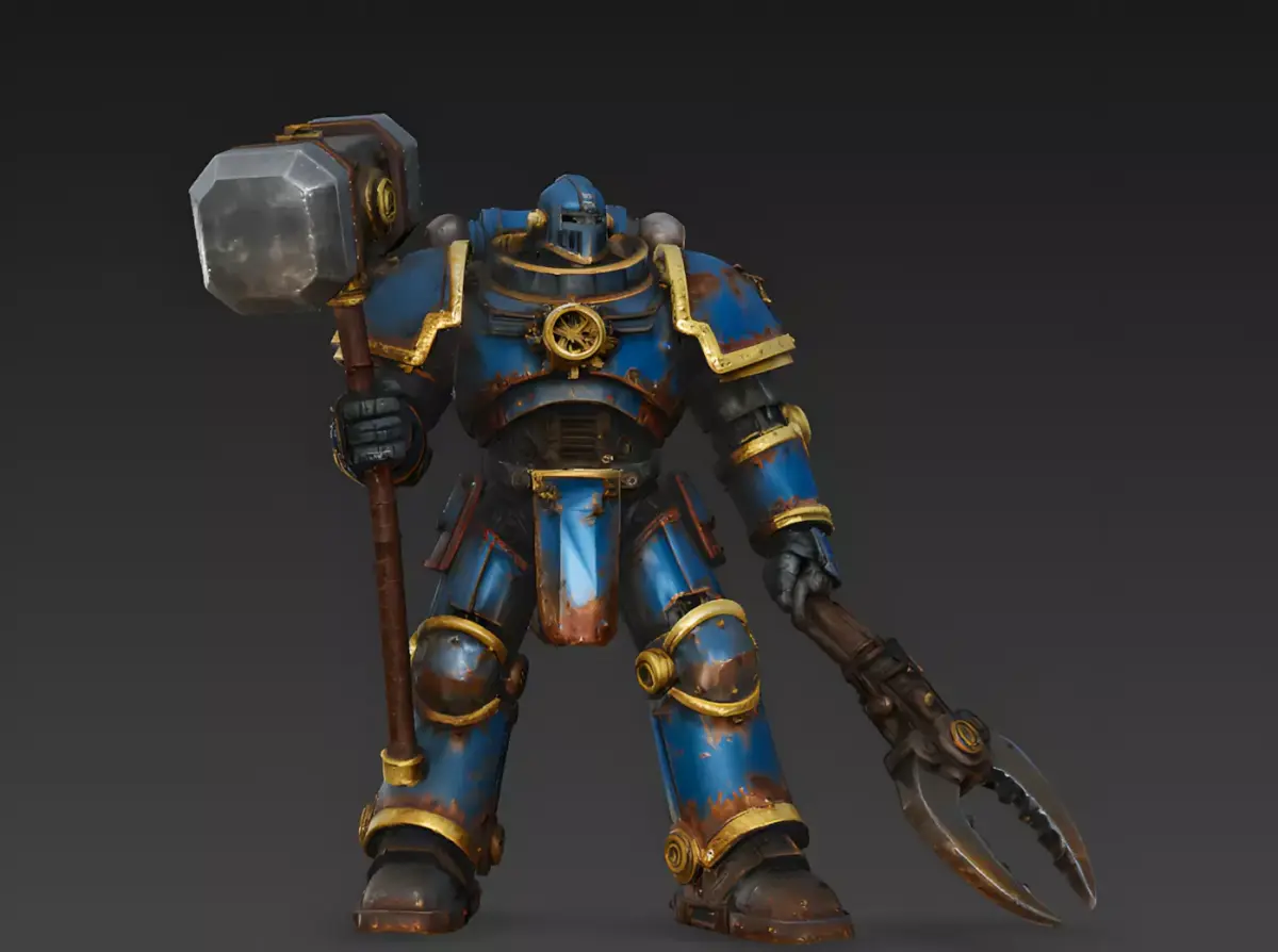 Ornate Blue & Gold ArmorThe sentinel is encased in thick plates of weathered blue-painted steel with polished brass trim. The texture work includes realistic rust patches and scratches, showing that this machine has survived countless battles on the front lines.