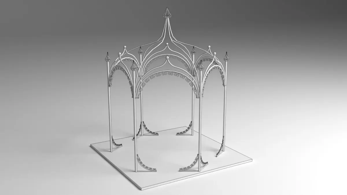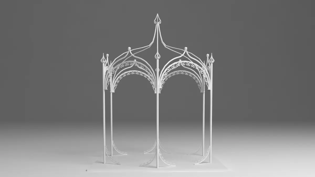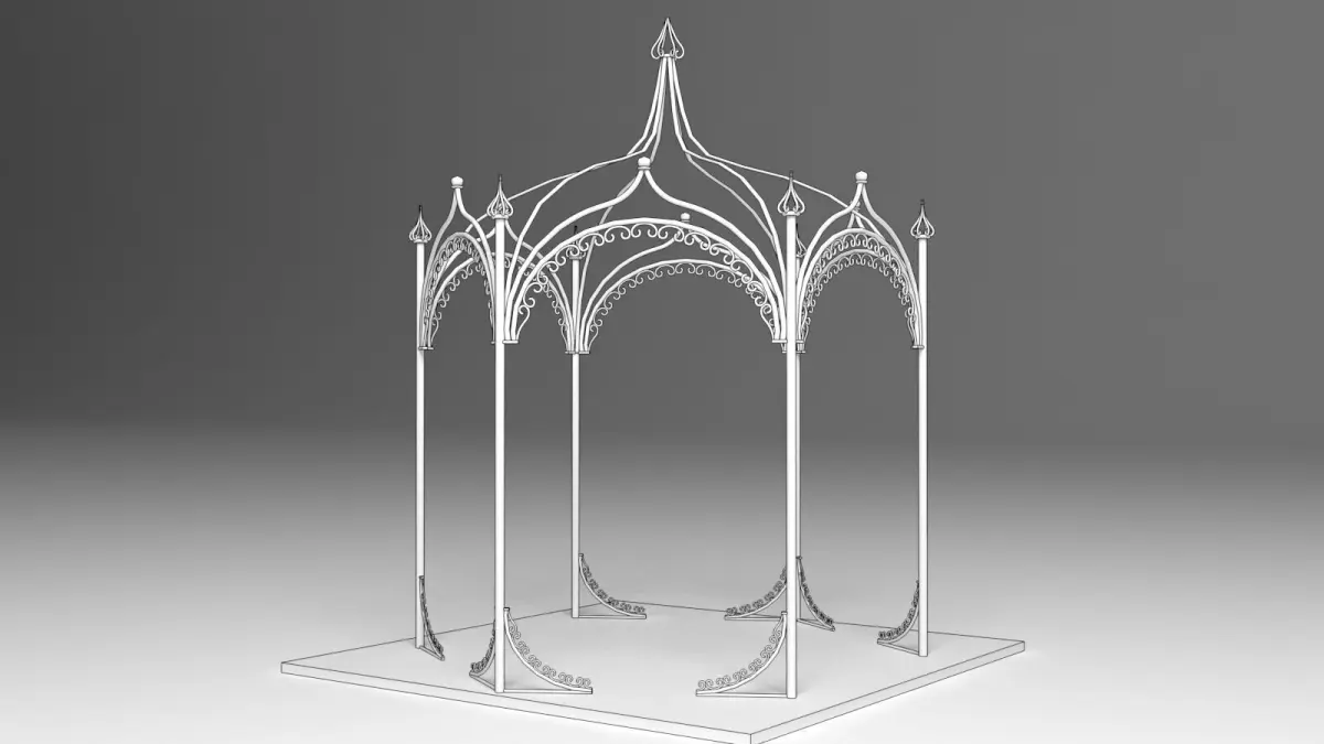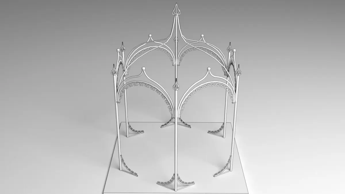 This high-quality 3D model showcases a beautifully crafted iron canopy, perfect for architectural visualizations, garden scenes, or vintage-style environments. Designed with a classic wrought iron aesthetic, the canopy features elegant scrollwork, curved supports, and a metal lattice or open-frame roof, reminiscent of Victorian or ornamental industrial styles.