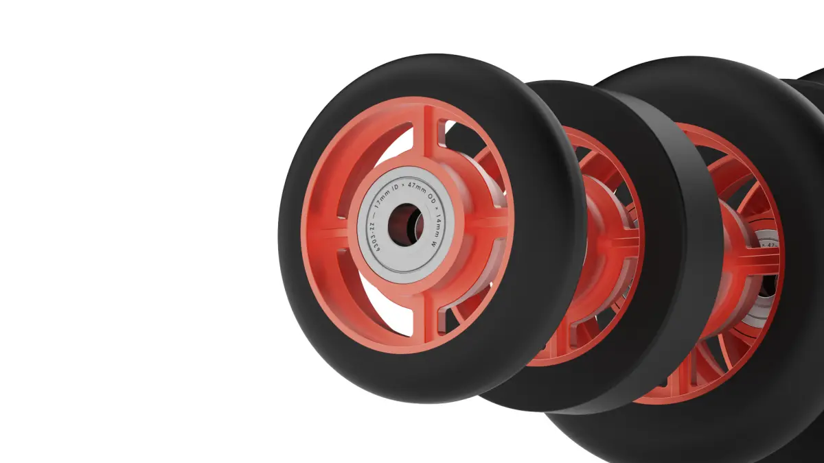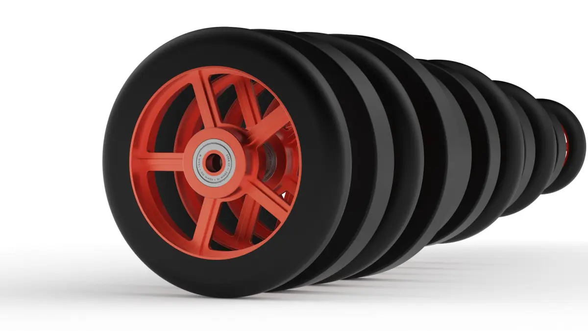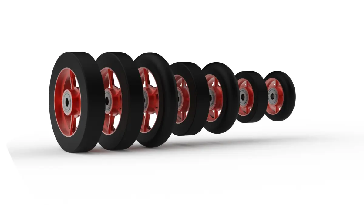 This 3D model pack includes over 10 industrial caster wheels featuring red cast iron cores with solid rubber tires. Each size from 6 to 16 inches includes both flat-top and round-top versions.