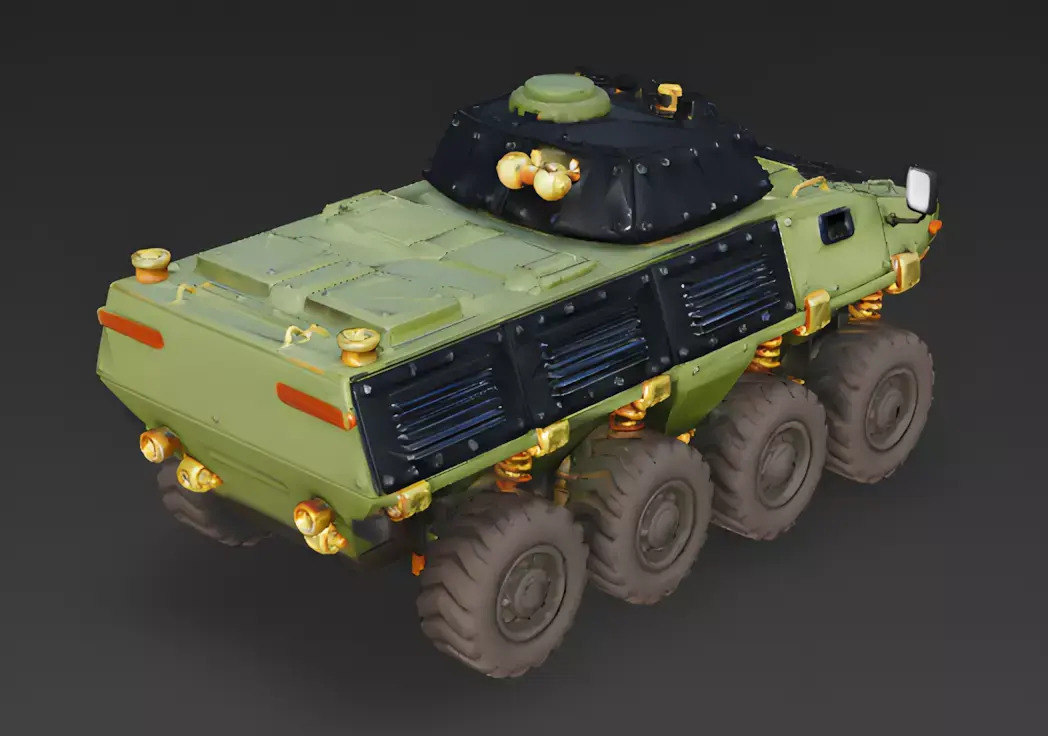 Reinforced 8x8 All-Terrain ChassisThe vehicle is built on a massive eight-wheeled chassis with oversized, deep-tread black rubber tires. Each wheel is supported by a visible golden coil-spring suspension system, suggesting the APC can transport troops at high speeds across rocky, muddy, or urban combat zones.