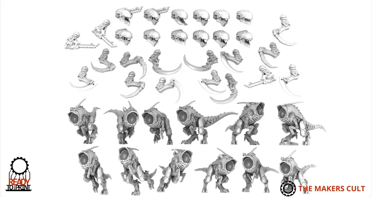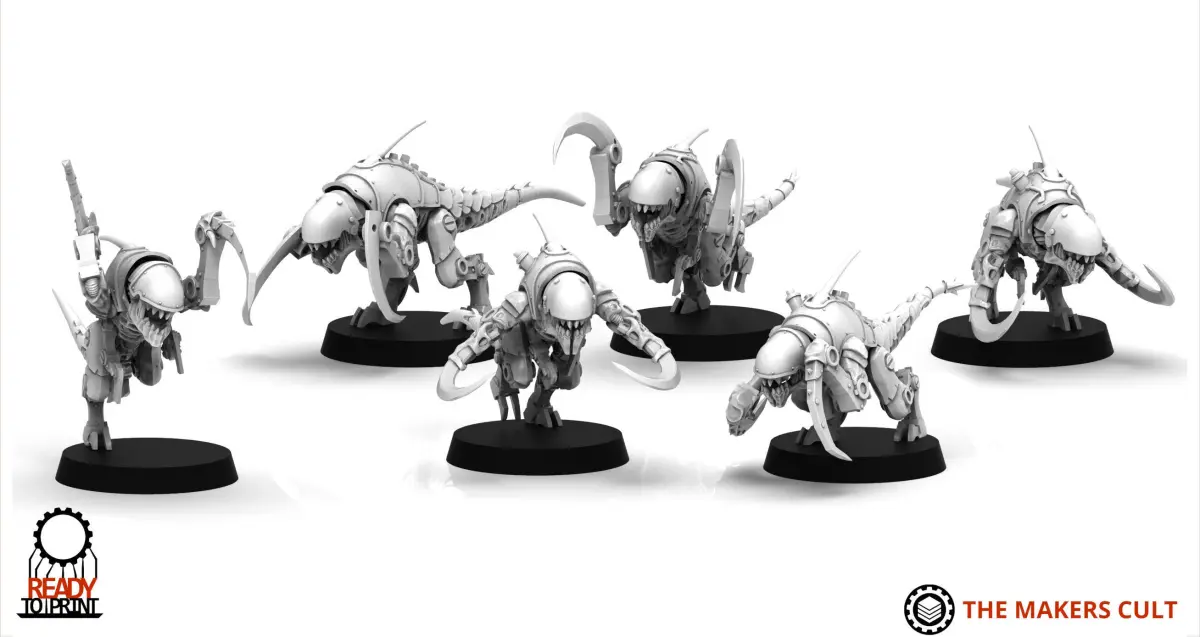 This is a new sculpt, easier to assemble and better posed version fo the Hormax, small leaping scythed xenobeasts of the Iron Hive.Fits on 28mm bases