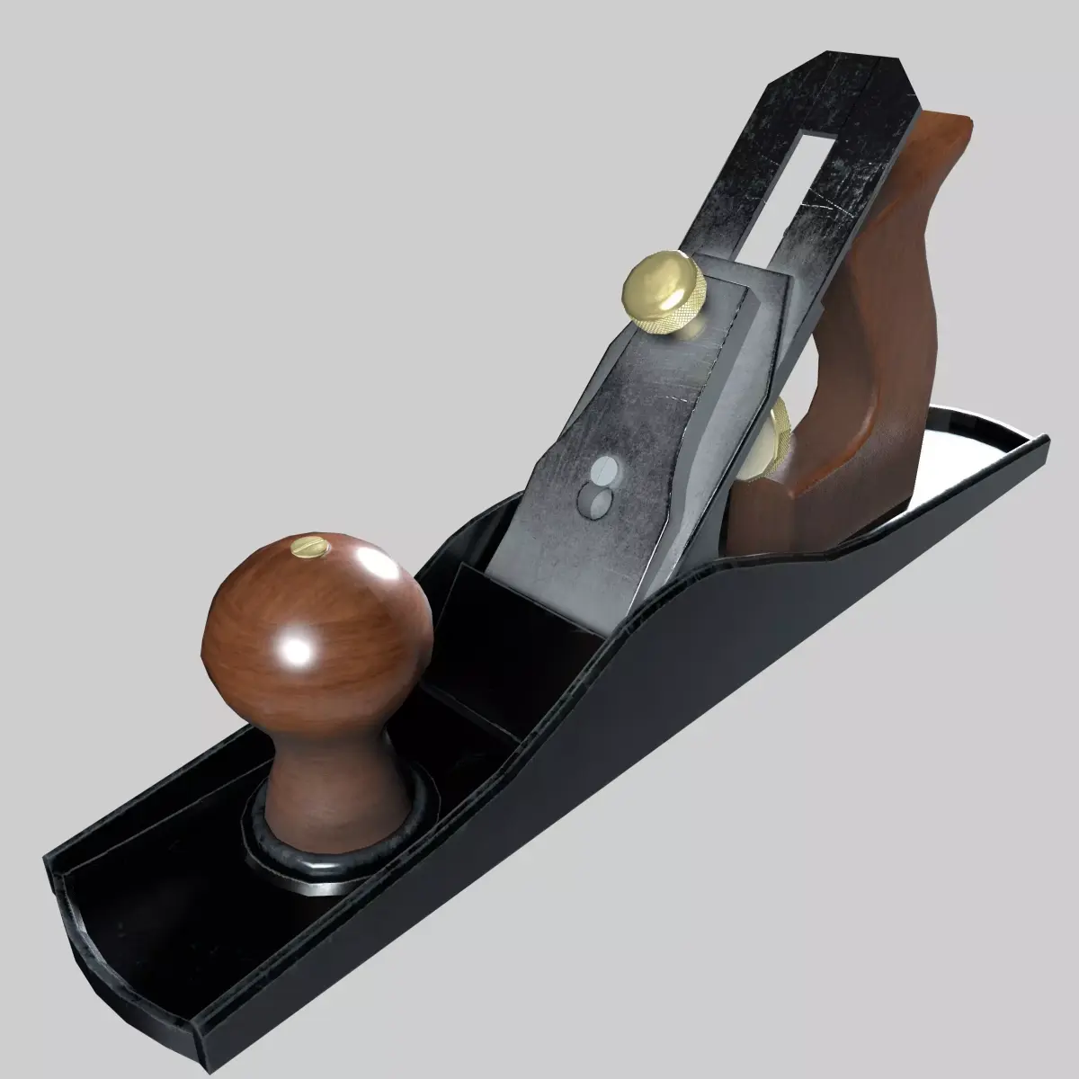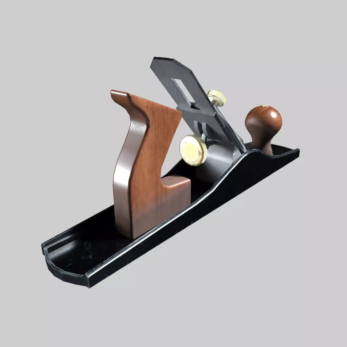 A highly detailed Iron Jack Plane 3D model designed for professional woodworking and carpentry visualizations. This classic hand planer features a cast-iron body, sharpened steel blade assembly, polished brass knobs, and smooth varnished wooden handles.