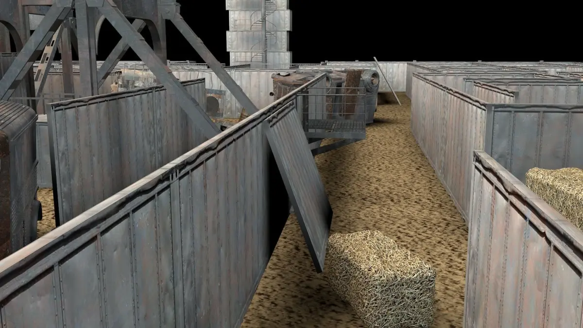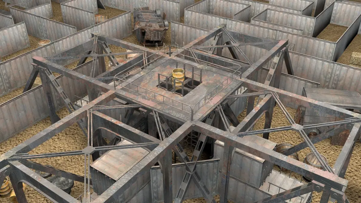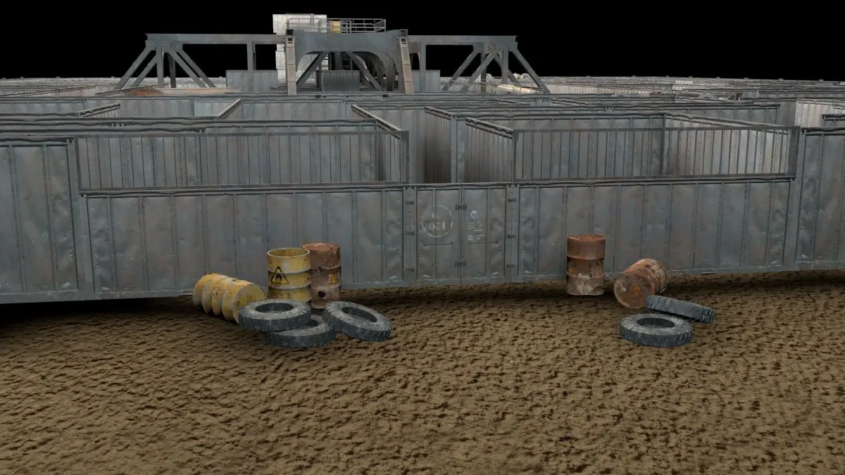 **ironmaze(DIY).RAR** has the empty maze and** individual FBX models** inside. Barrels, boxes, wrecks, palletes and other models can be placed in the empty maze. This file also needs **TEX(FBX)** folder only for textures.