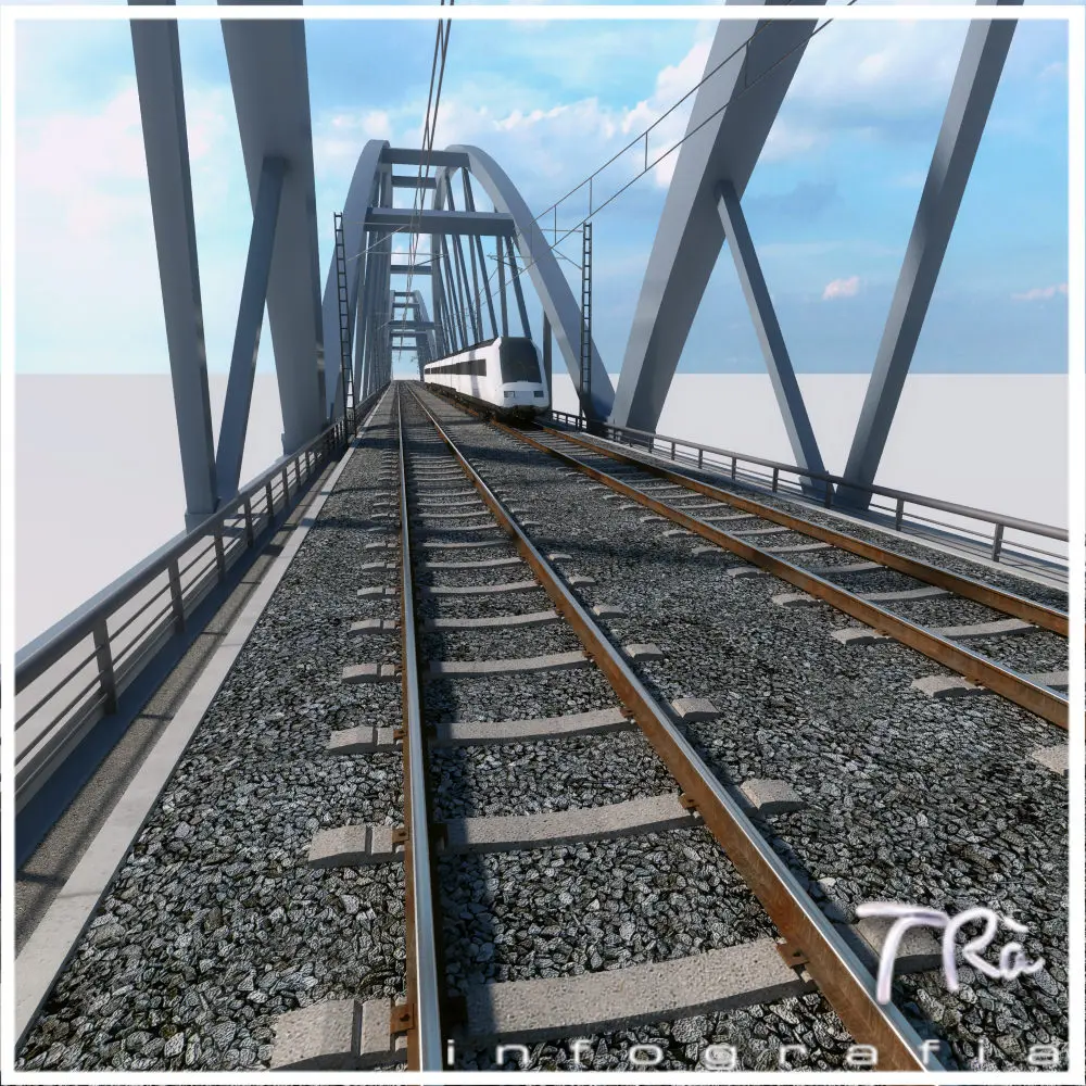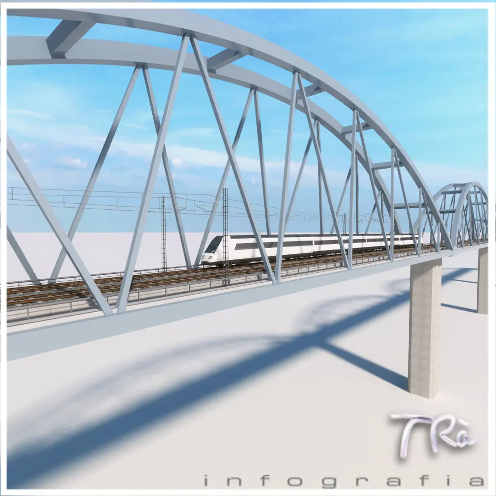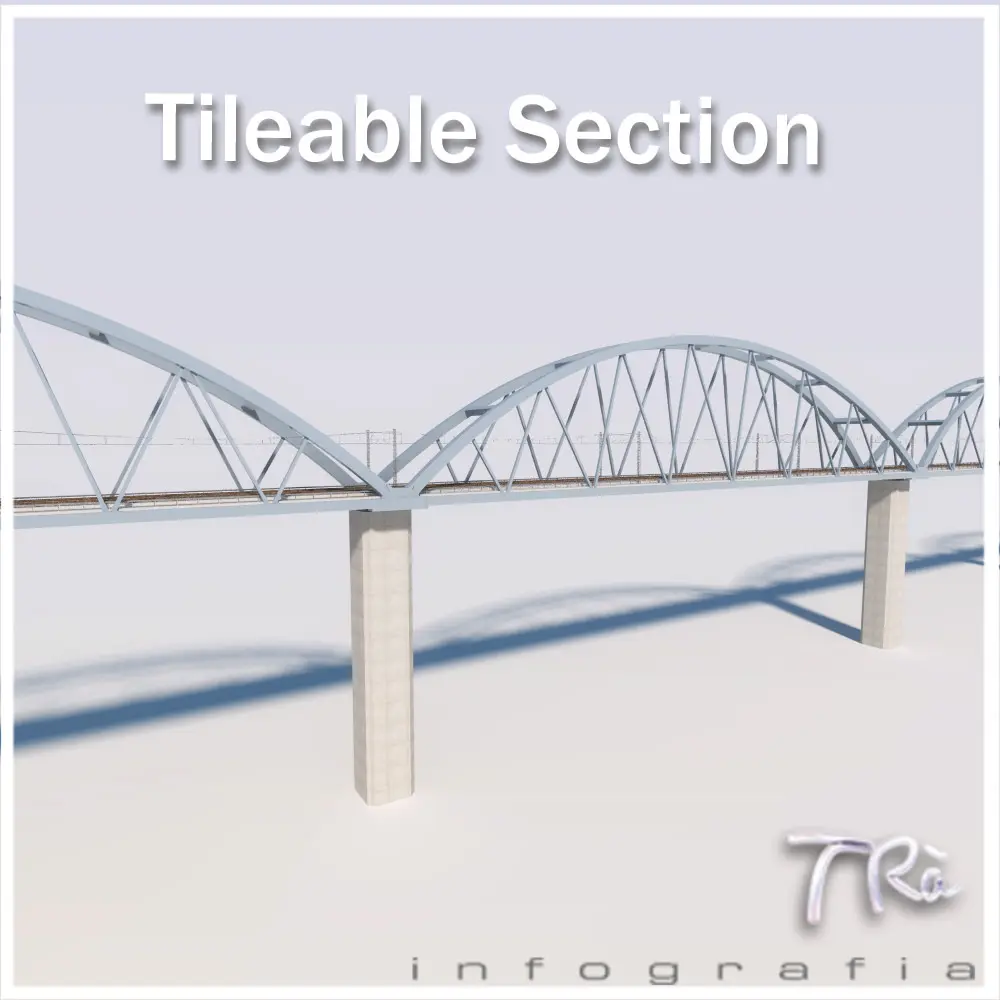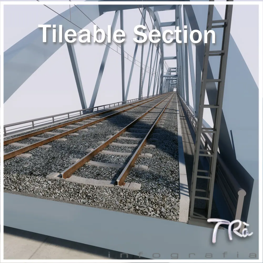Bridge section arched structural metal tileable railroad tracks (along a pathdeform with a displacement of the same for the length of the section), so you can build bridges infinite and desired shape. Designed and built for horizontal bridges or with small slope in the field, modeled with Max 2010 and Vray materials. Includes materials and maps. Train not included.