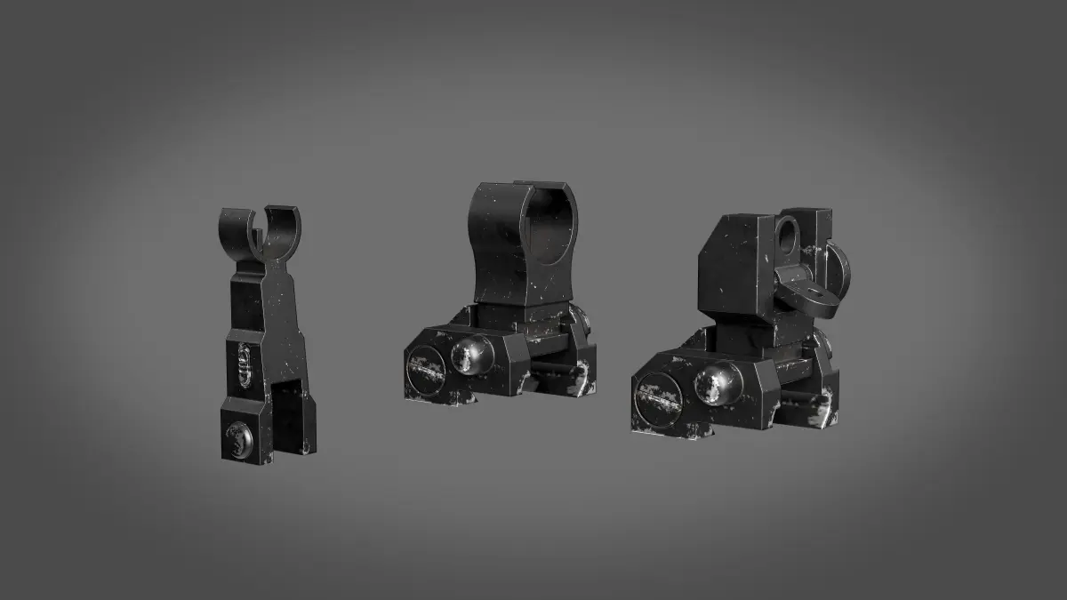 Iron_Sights. Low poly model with two Texture sets(PBR). Originally created in Maya. Preview rendered with Marmoset Toolbag 4Model info:All objects, textures and materials are named appropriately. The model is built in a real scale. Clean topology. Geometry is fully triangulated to ensure the best shading. There are 6 separate parts in this mode The model has - 4509 tris / 2259 verts
