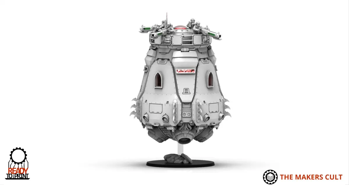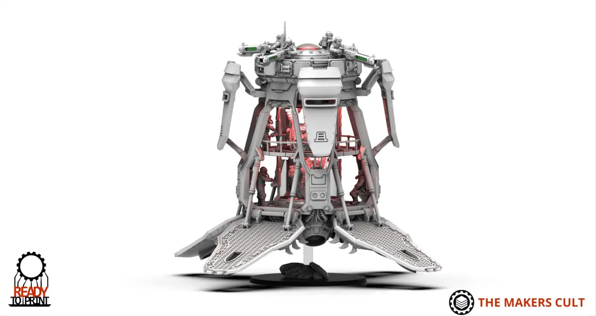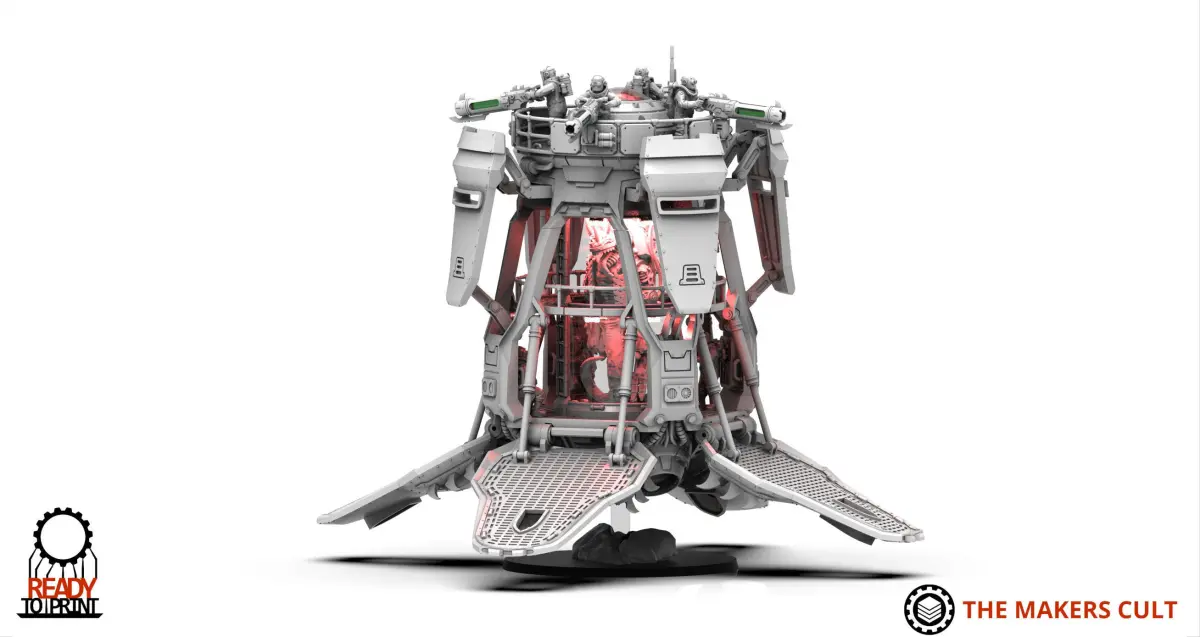 The Exopod is a mobile fortress for the Ironblood troops. It can be used, for defense, support or cloning creatures on the battlefield.This large kit includes many building options, and movable door mechanisms, as well as crew for the Exopod.Fits on a 100mm round base, using an 8mm rod for flying.All parts can be printed in Mars or Photon printers. Larger 3Dprinter is recommended thoughOverall size : about 17cm tall, 13cm diameter (closed) 27cm diameter (fully open)