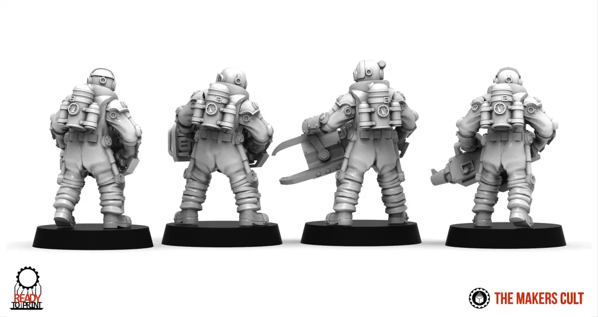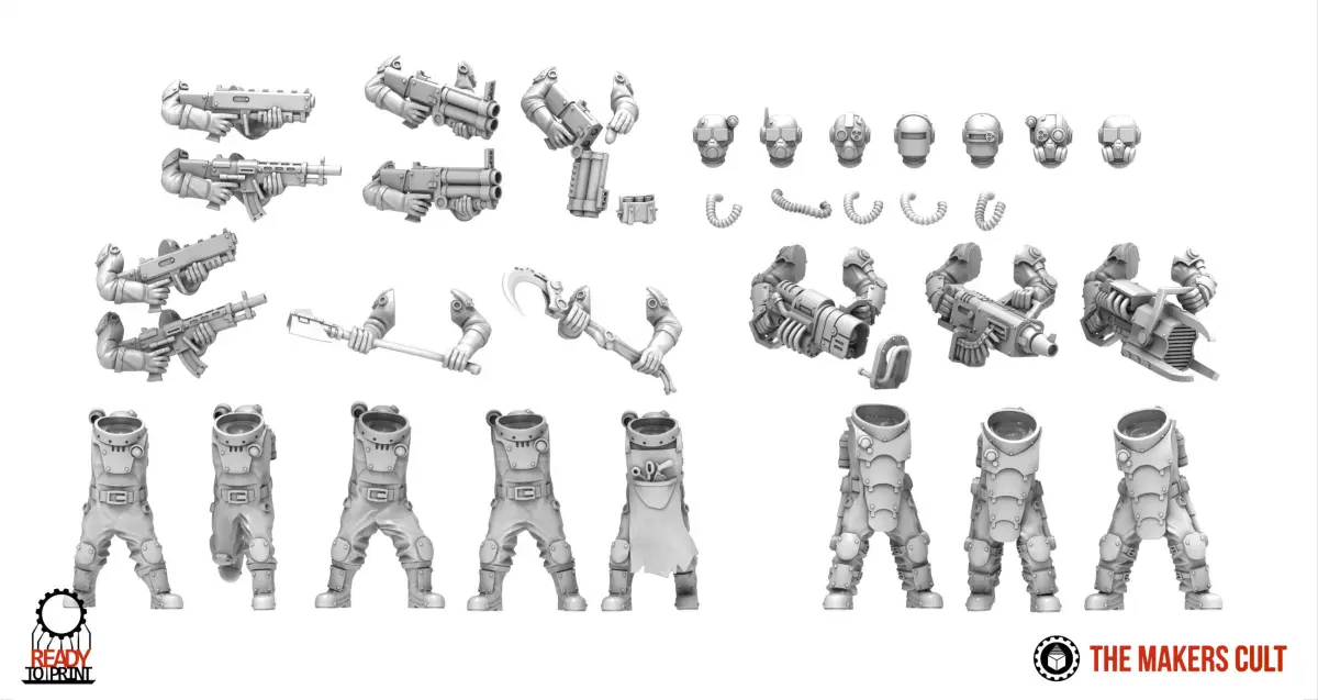 Some of the workers of the Ironblood need special or heavy equipment.This set includes parts fully compatible with the Plodders set and allows to build many other combinations, including heavy working suits.Fits on 25mm bases