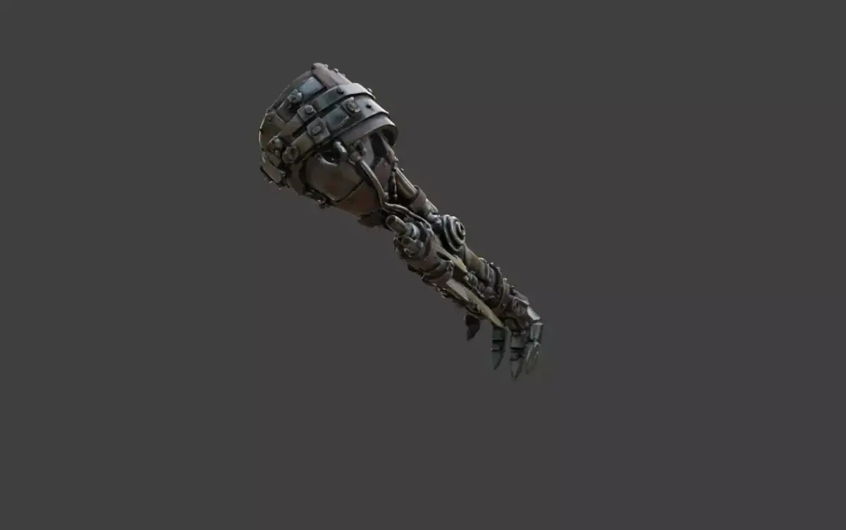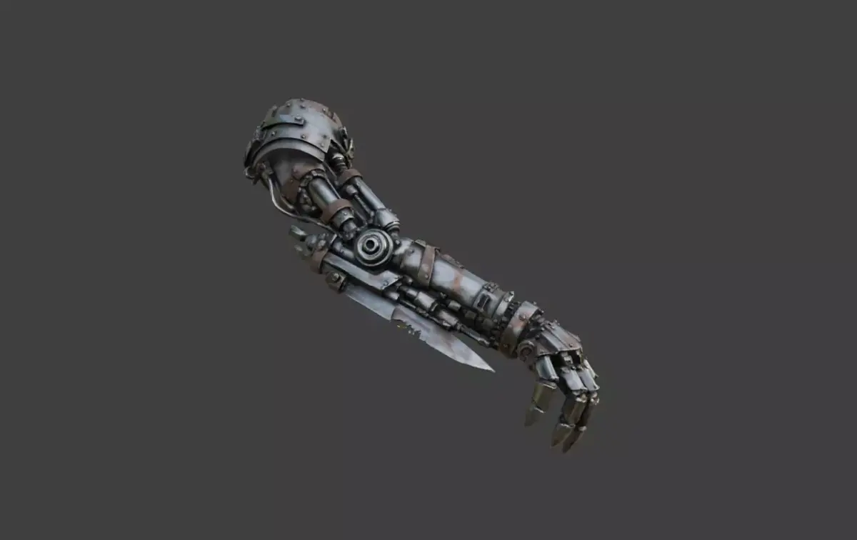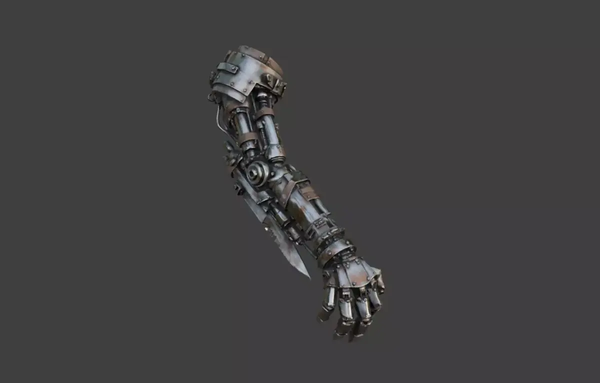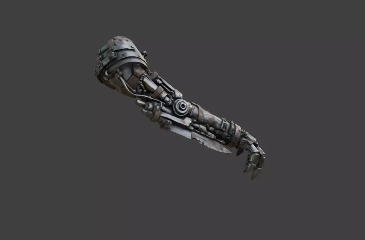 Mechanically, the arm showcases pistons, tubing, rotary joints, and segmented finger articulation. These details support believable animation rigging for grasping, punching, or blade extension sequences. The industrial wear and subtle rust variations add authenticity, reinforcing the concept of a well-used battlefield prosthetic rather than a pristine sci-fi limb.