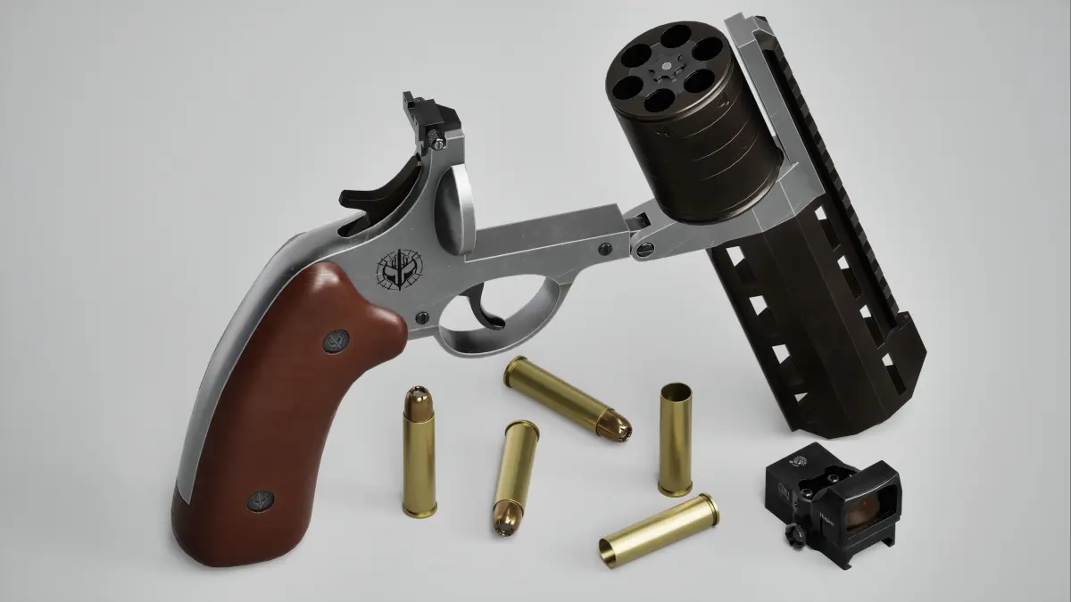 The asset pack includes a revolver, a bullet, a case, and a sight