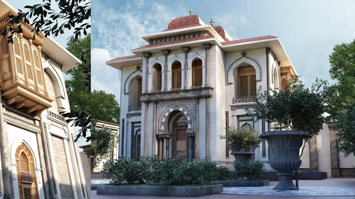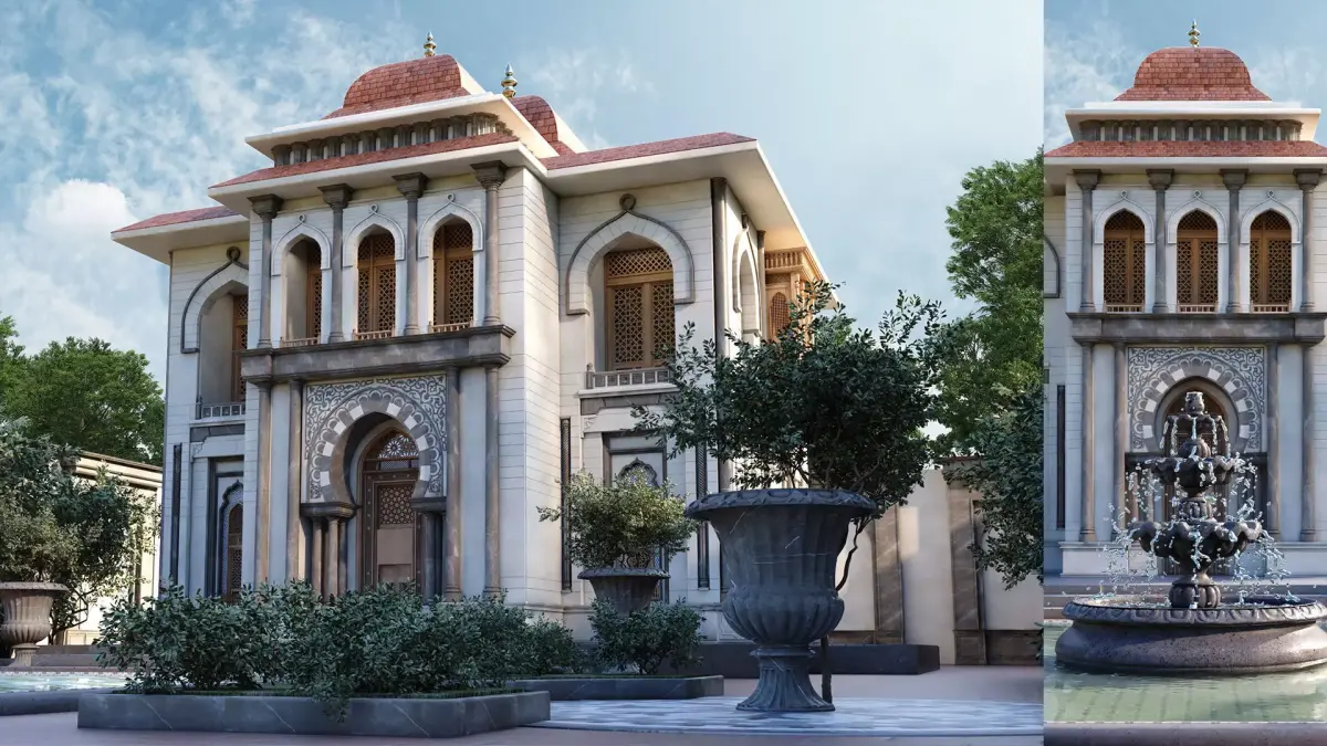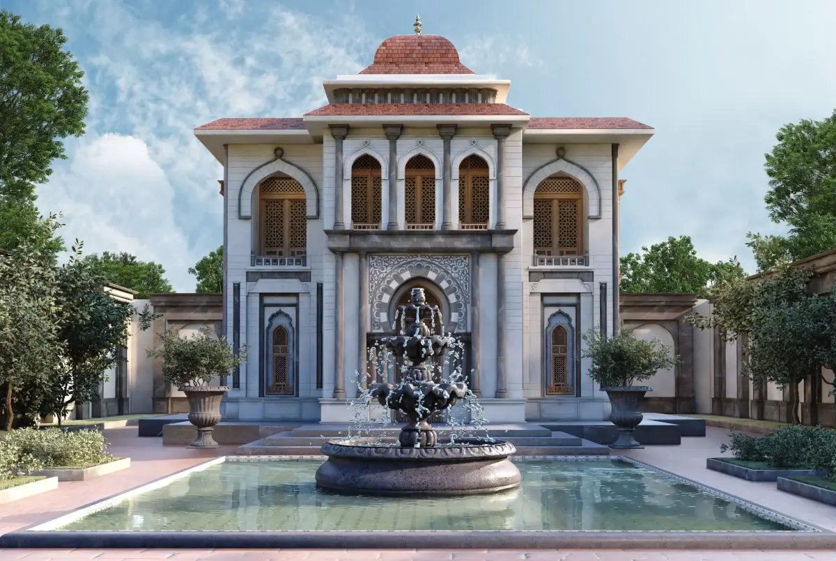 This 3D model presents a complete luxury villa in Moroccan / Arabian-Islamic architectural style, including detailed exterior design, courtyard, traditional fountain, and greenery.