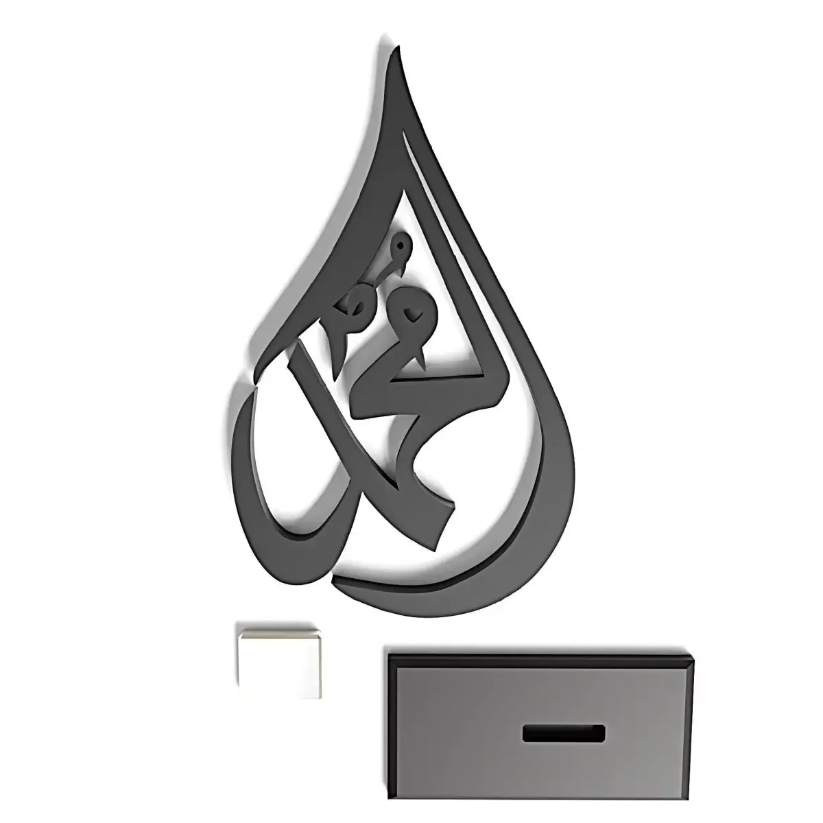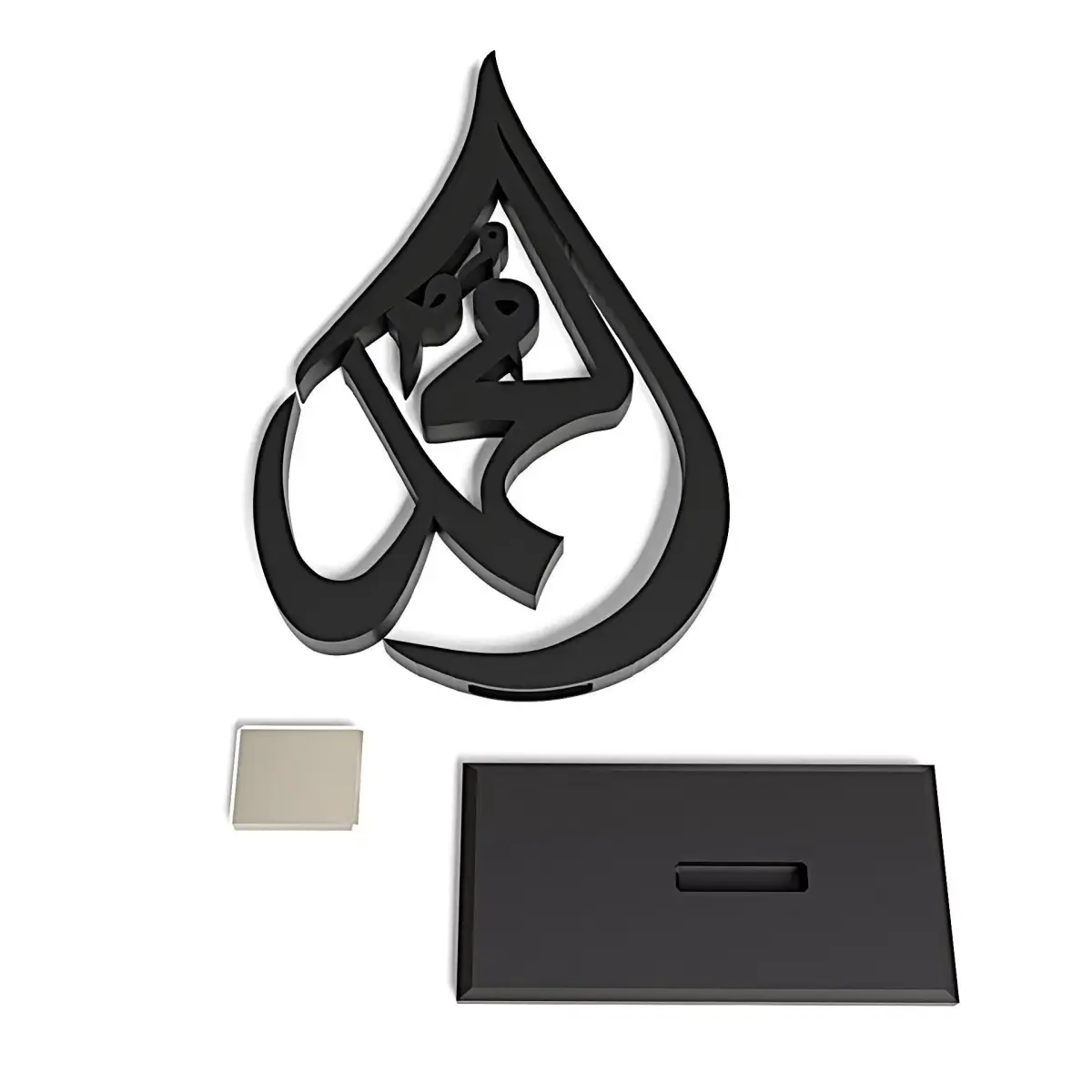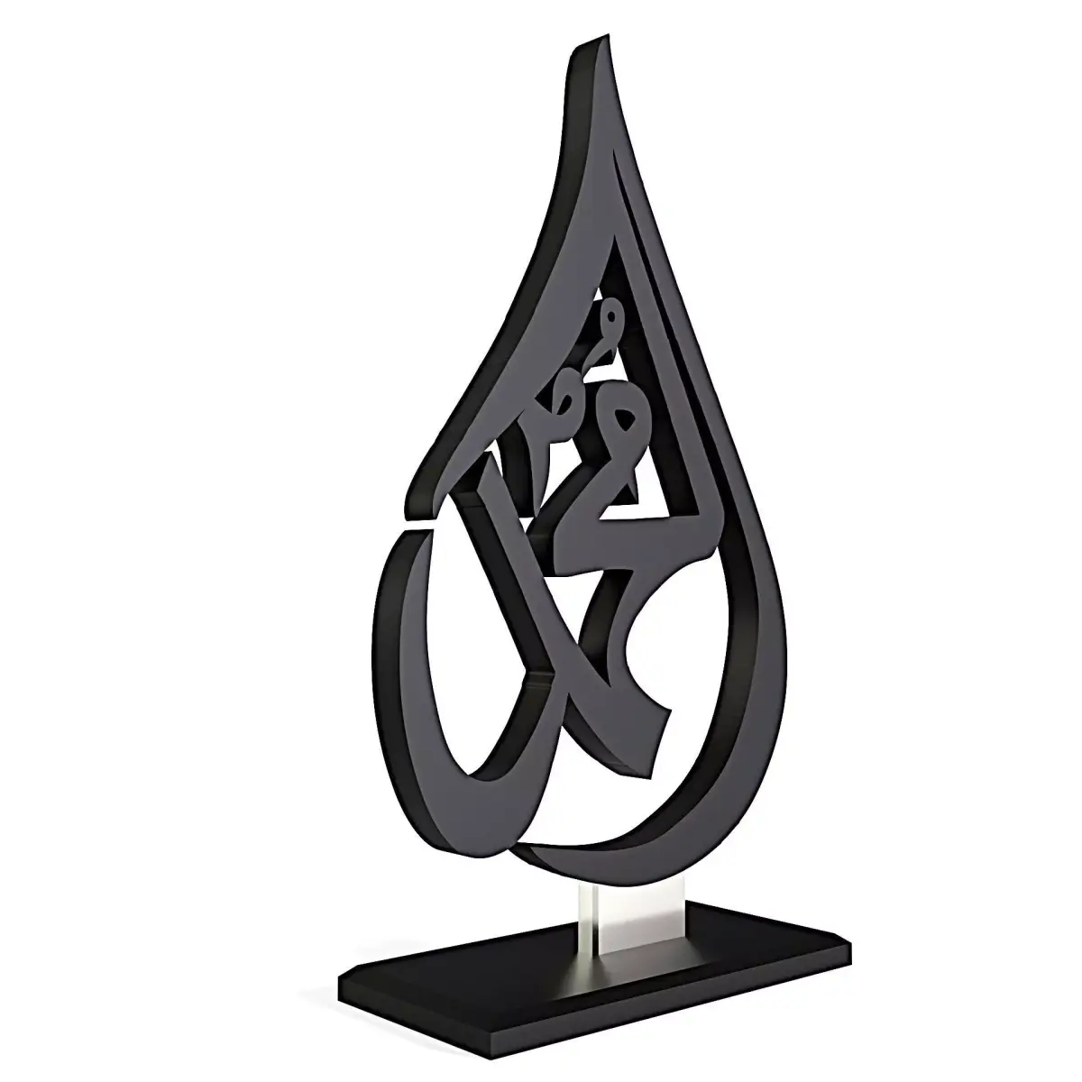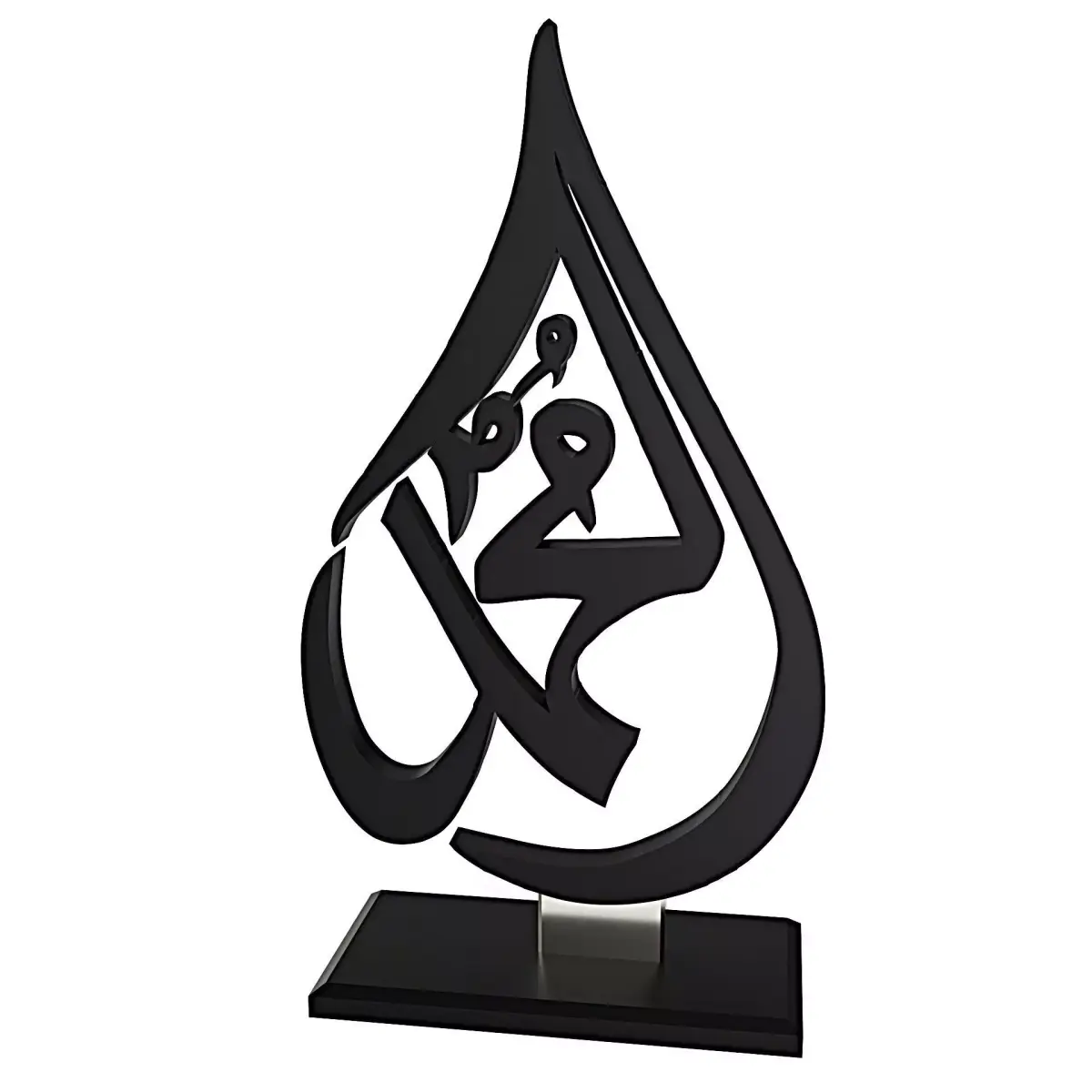 High-quality 3D model of an elegant Islamic Arabic calligraphy sculpture designed as a modern table decor piece. The artwork features a stylized teardrop-shaped frame with Arabic calligraphy inside, mounted on a minimal rectangular base. Suitable for interior visualization, Islamic decor scenes, product rendering, architectural presentations, and 3D printing.