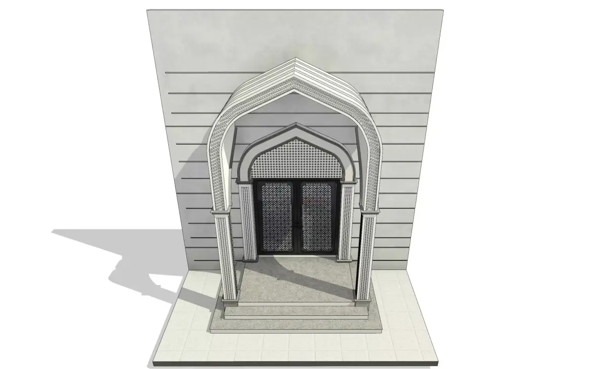 A realistic Revit 3D model of an Islamic-style mosque entrance arch, featuring elegant traditional curves, pointed arches, and ornamental details.This model was designed with accurate proportions and architectural logic — perfect for use in Revit scenes or for learning Islamic architectural detailing.