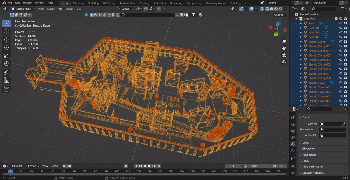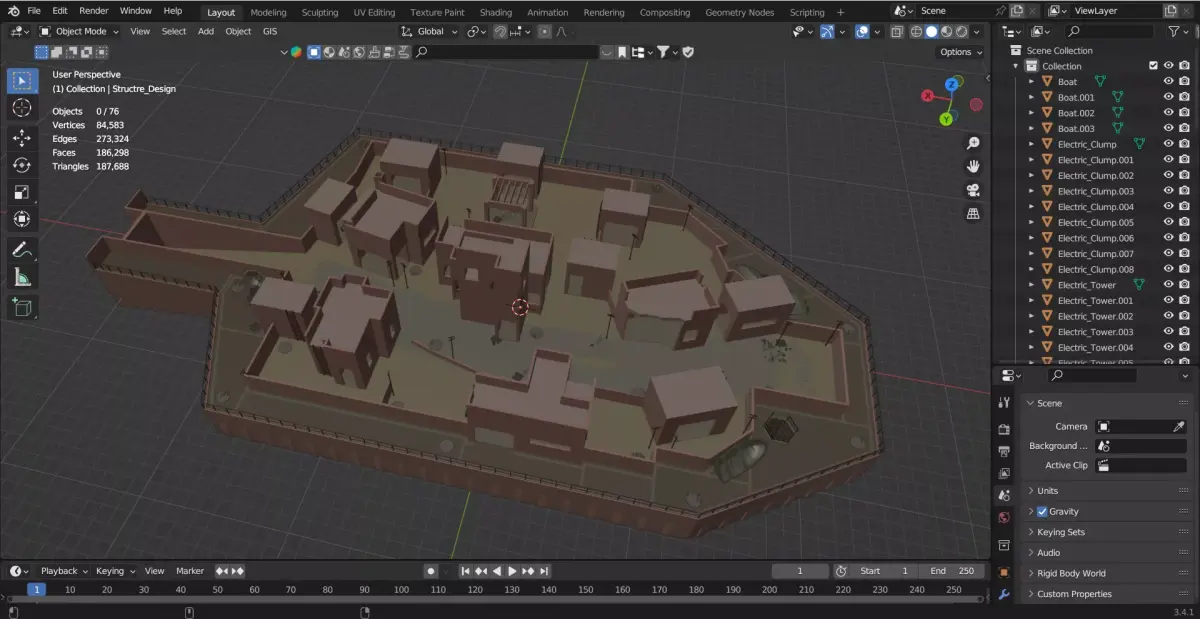 This Island Arena Battle Map is carefully designed in Blender 3.4 using high quality PBR textures and optimized geometry for smooth performance in game engines. The environment is created on an island with water surrounding all sides and wooden boats placed around the arena to enhance realism. The center area features an old destroyed road combined with electric towers to give a strong battle and warzone atmosphere.
