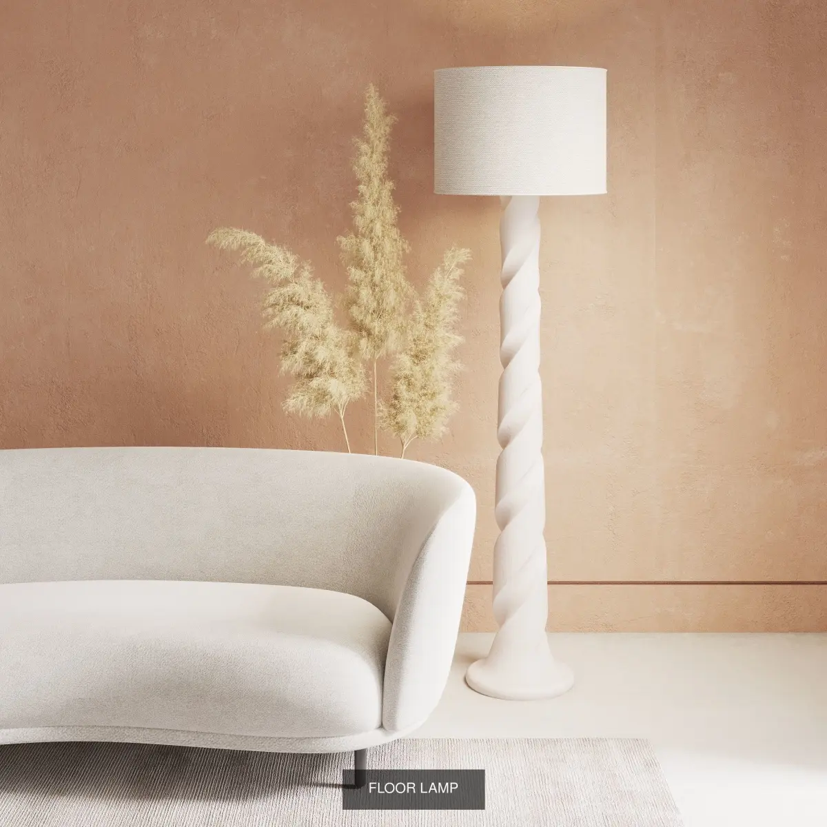 Featuring a round base and twisting resin neck, topped with a woven drum shade floor lamp.