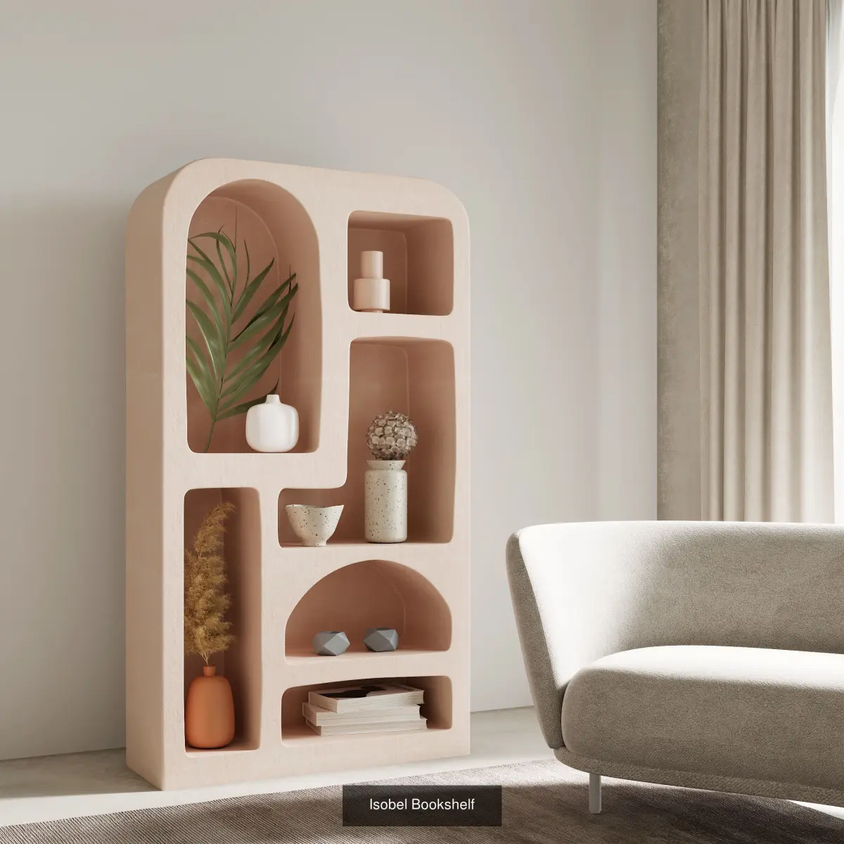 The possibilities are endless with this eclectic bookshelf that instantly upgrades your design and renderings with an artful display. Use it to show recent reads, favorite ceramics, plants, trinkets, art pieces and so much more with six unique cubbies in different shapes and sizes, featuring irregular rounded edges and a faux stucco finish.
