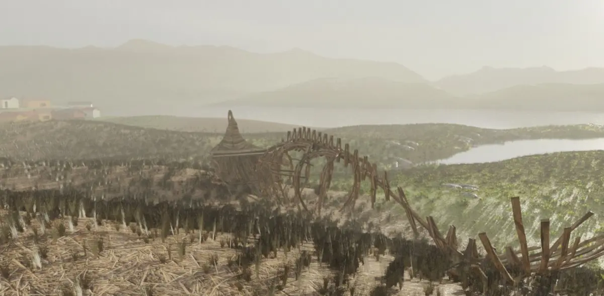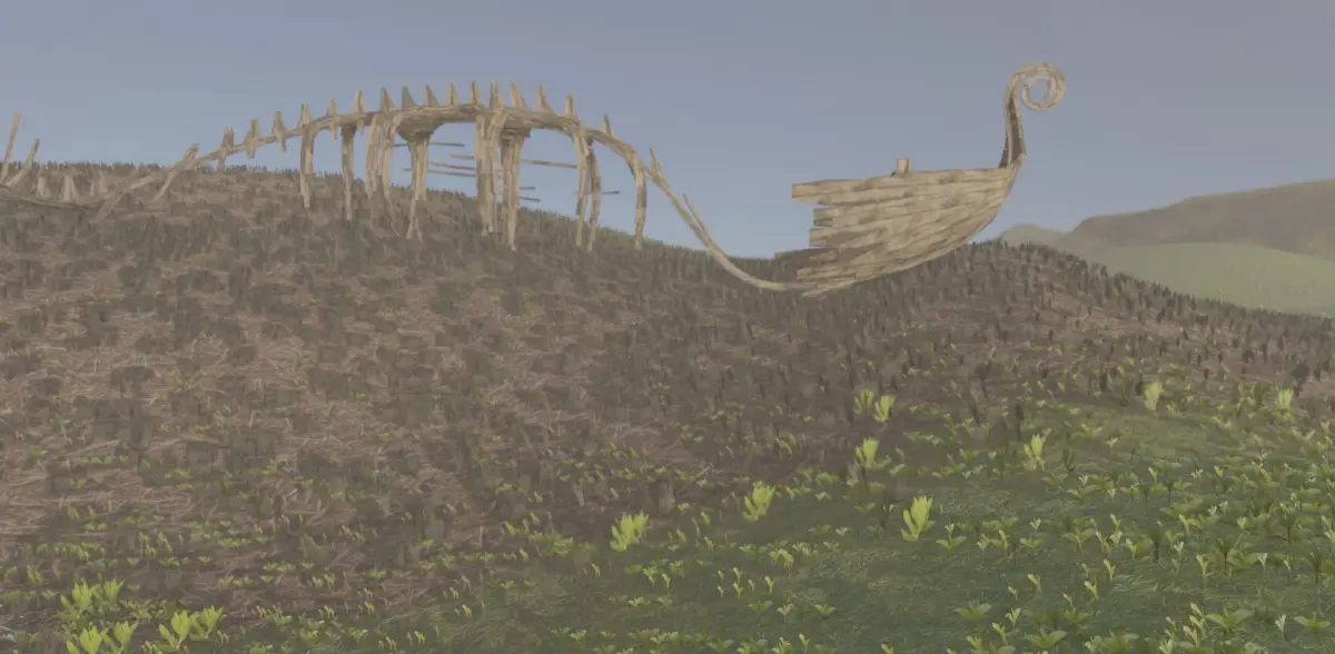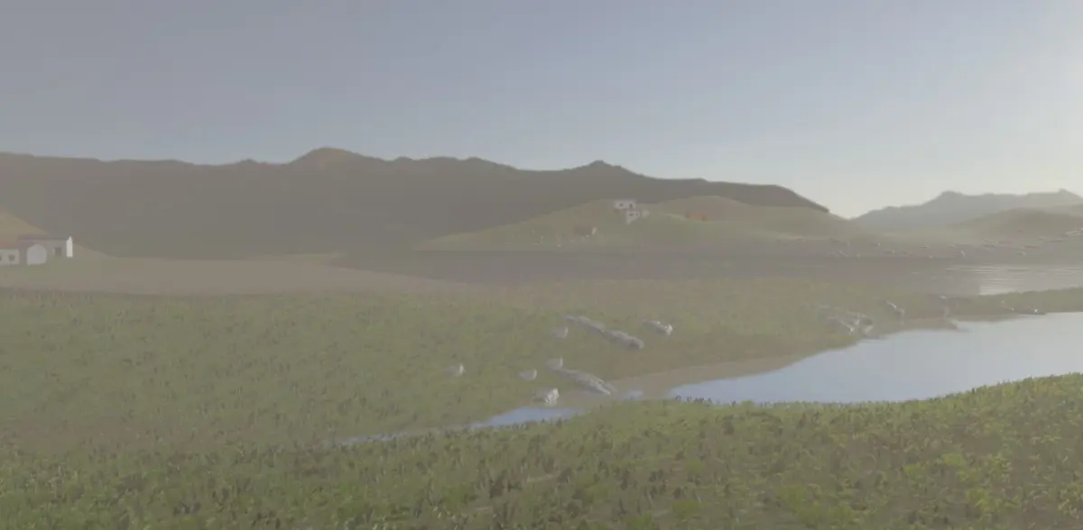 Besides the land, the model contains multiple props for particle systems; Distant houses, 5 different types of grass, and 5 different rocks.