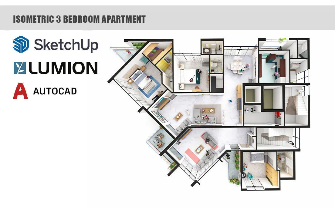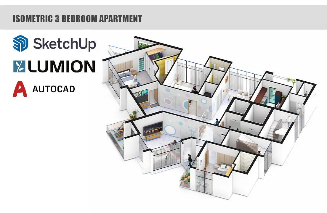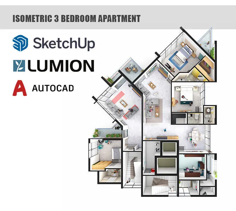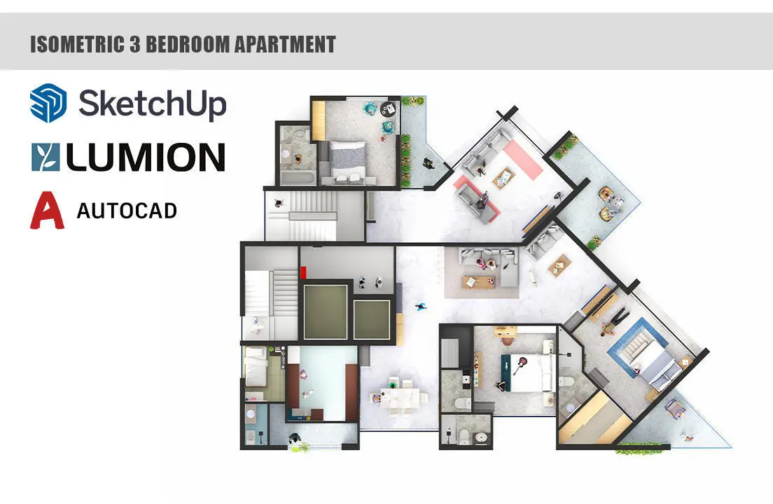 Isometric 3 bedroom apartment layout 3d Animation rendered in Lumion 12 was modelled in Sktechup 2021. This apartment interior has been designed for residents of Tropical humid climates. Greenery is prevalent within the interiors and creates a welcoming ambience for the inhabitants.