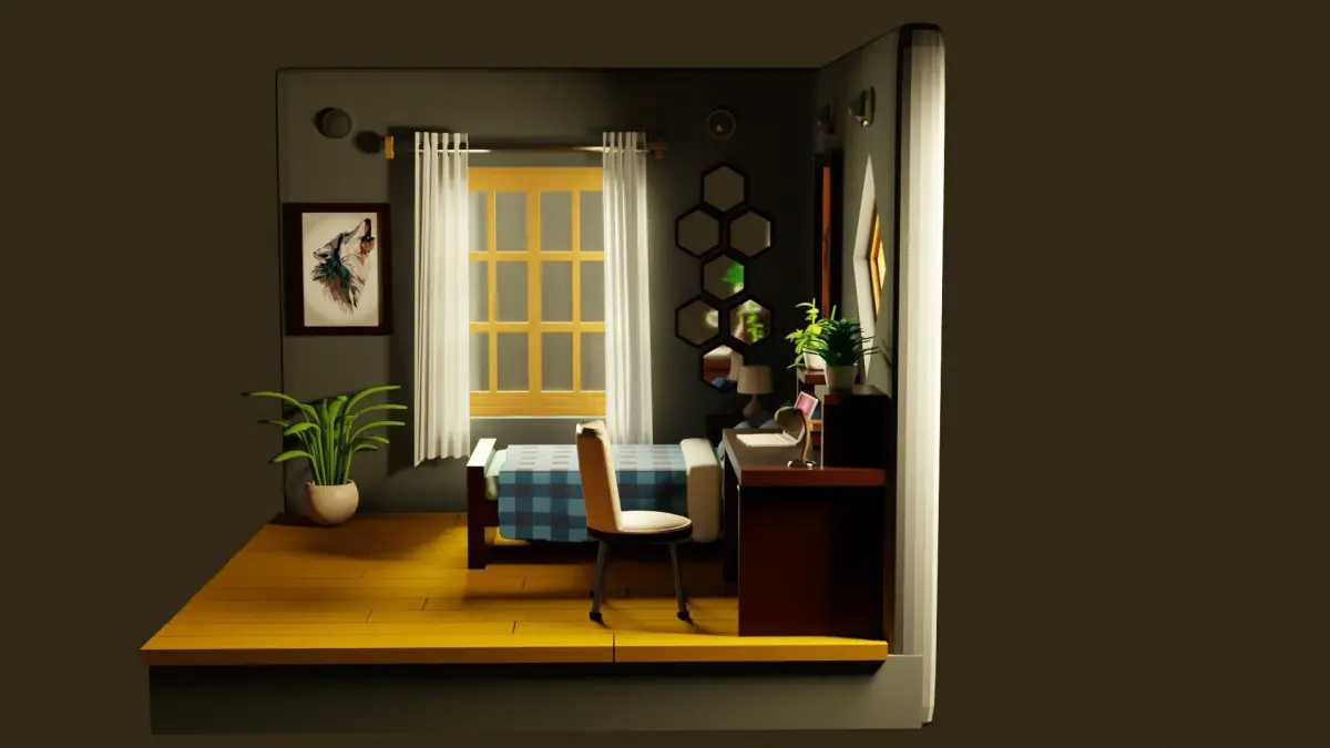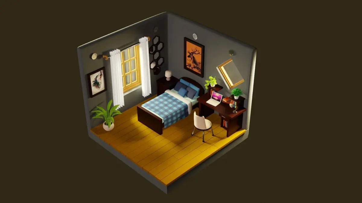 I created this Isometric Bed Room (B) using Blender 3.0.1. All house objects are named and separated. In this model textures are use only for hanging photos and laptop wallpaper.