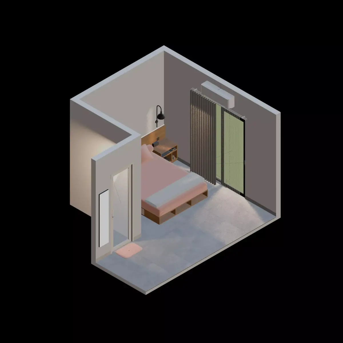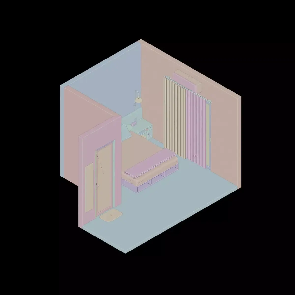 Isometric bedroom 3d render design element illustration, including a bed, a bedside table, wall, window, air conditioner, curtain, door, and floor. Suitable for house or apartment interior. Originally made in Blender, also available in .OBJ and .FBX file format