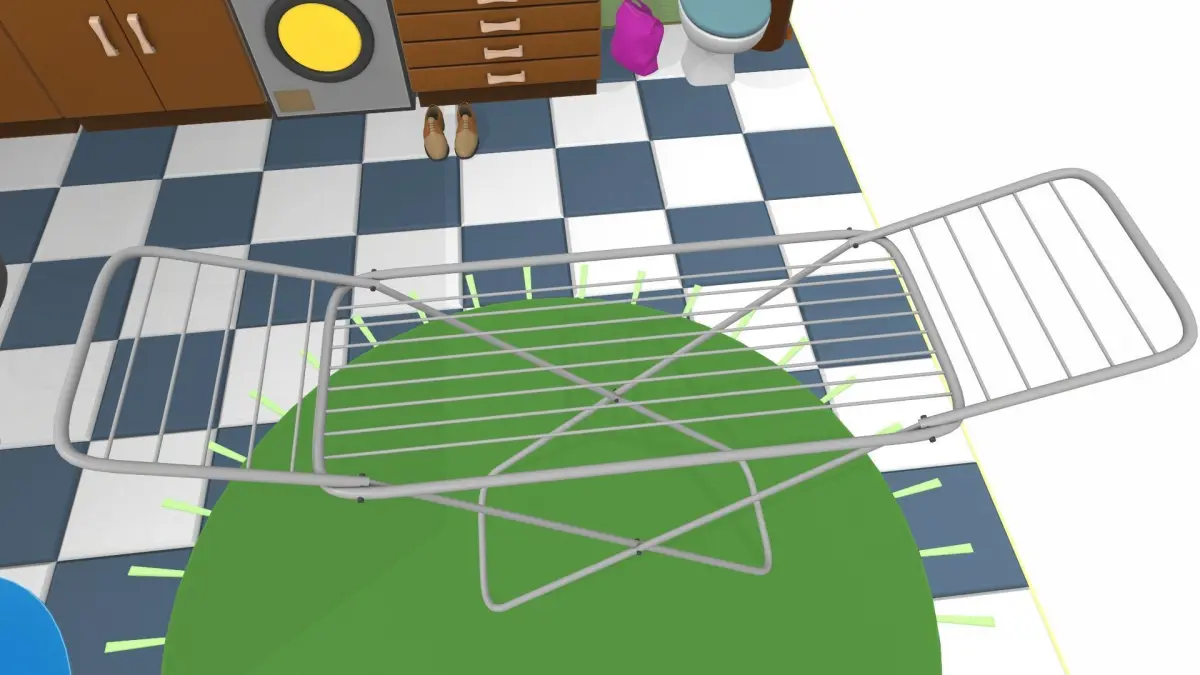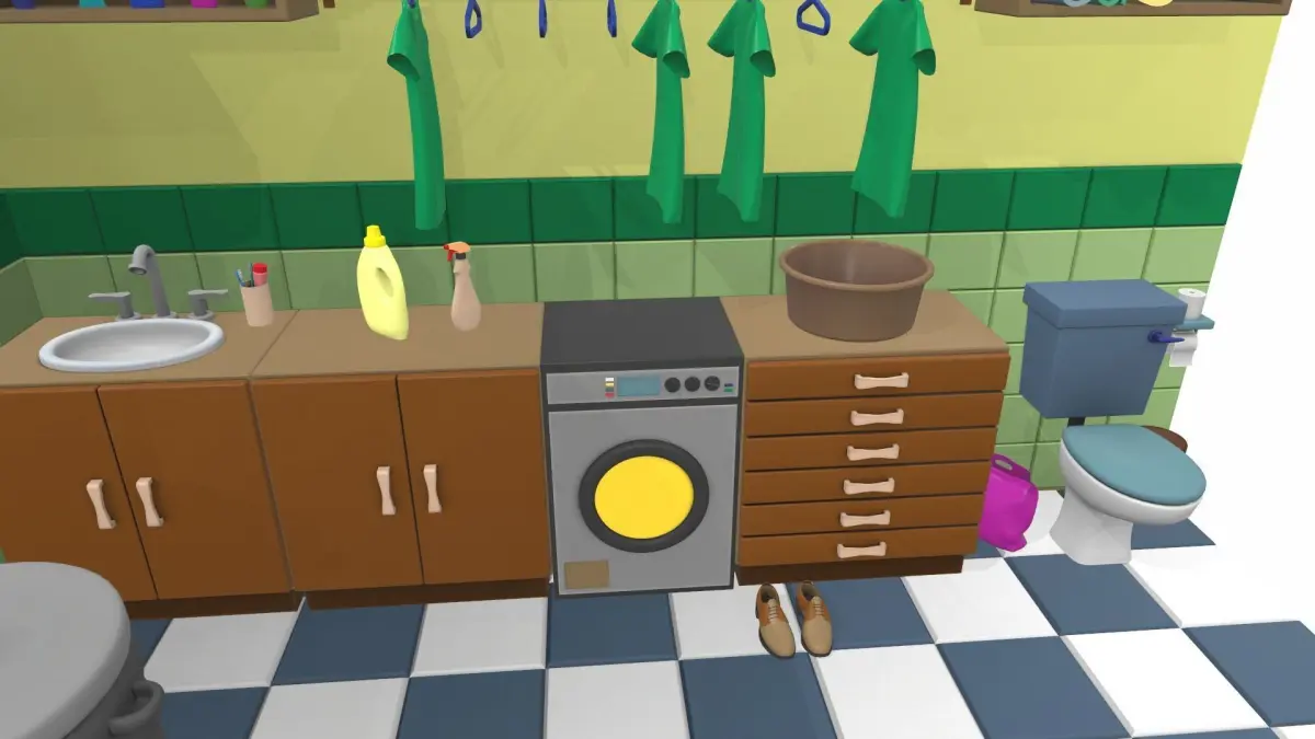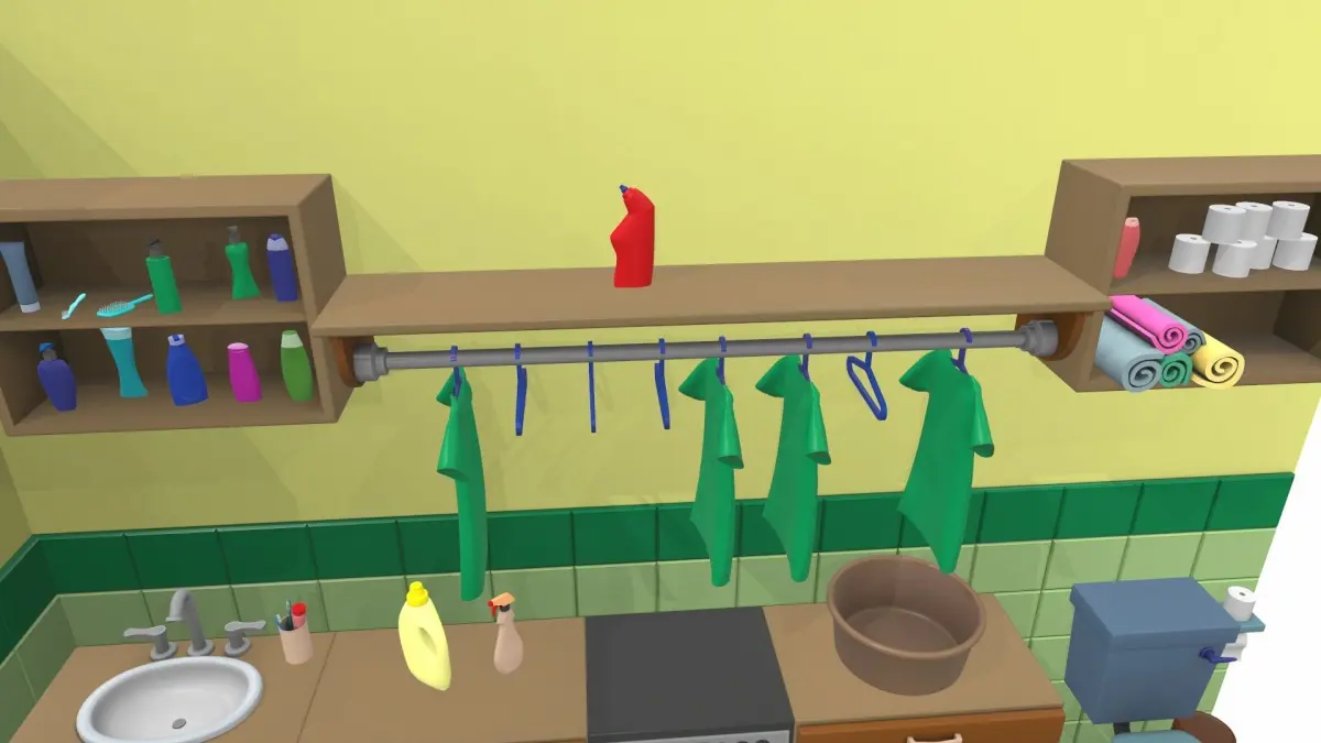 basin, bath, bath handrail, bath tube, bin, cabinet wall, carpet, cleaners, clothes, clothes rack, comb, hanging hanger, hygiene products, laundry basket, shampoo, shoe, split system, toilet, toilet paper, toothbrush, towels, tube, washbasin, washing machine, washing powder, window