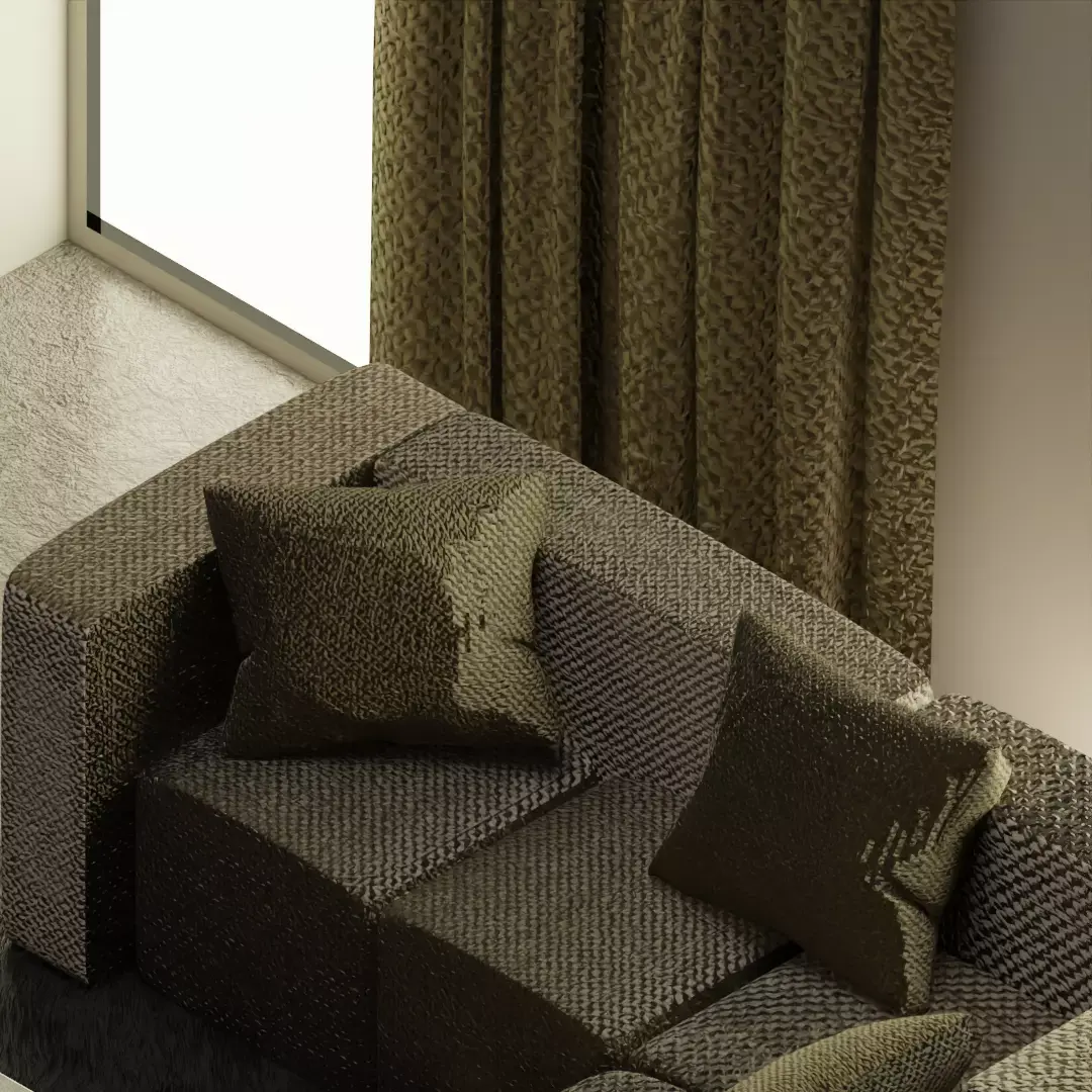 This is a highly detailed, photorealistic 3D model of a modern living room, presented in a captivating isometric view. Ideal for architectural visualization (ArchViz), interior design presentations, game environment concepts, or high-quality portfolio showcases.