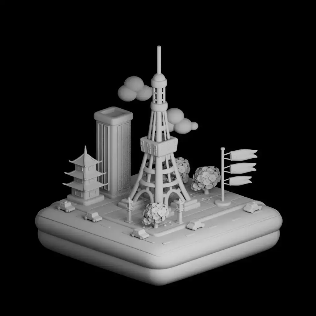 •Tokyo Tower (stylized landmark)•Japanese pagoda temple•Modern skyscraper•Sakura cherry blossom trees•Koinobori festival flags•Street lamps• Mini low-poly cars•Complete isometric base platform