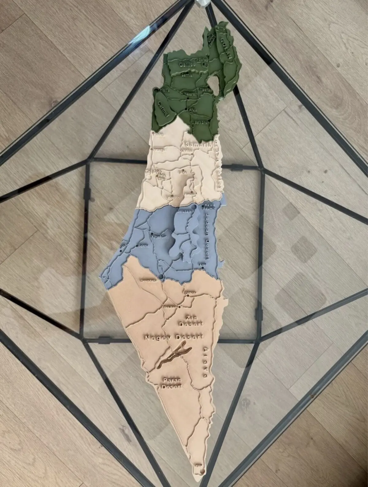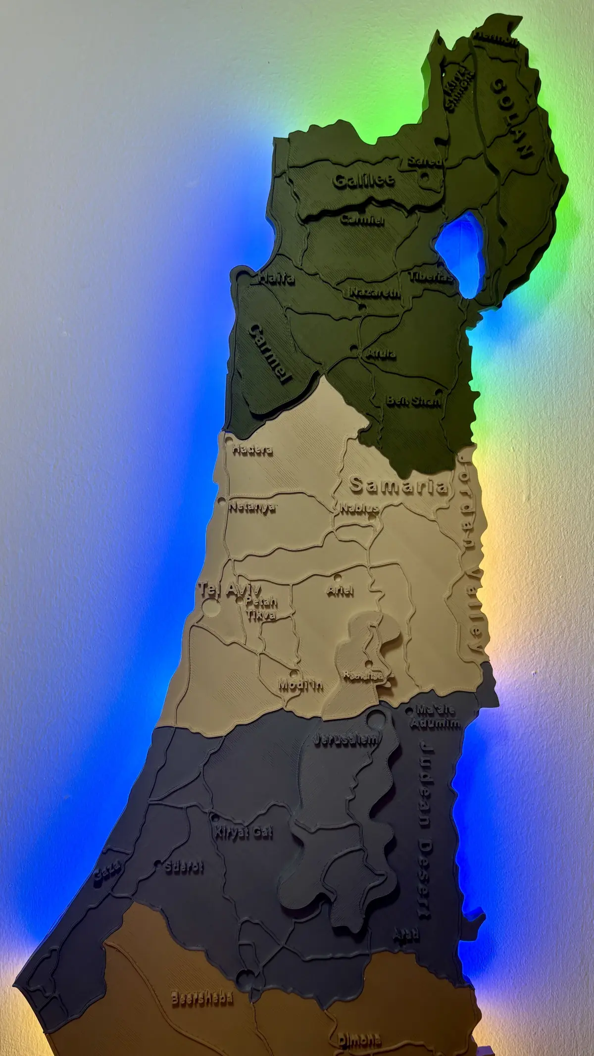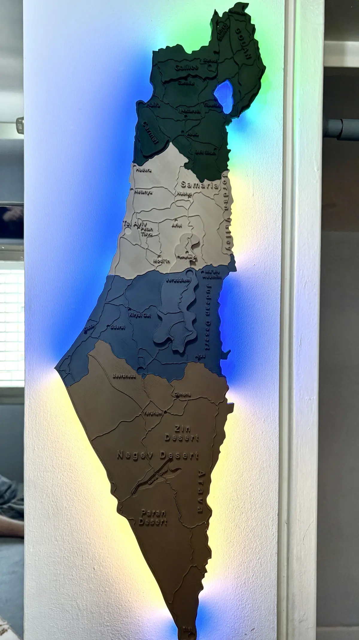 Lighting has deep spiritual symbolism in Jewish tradition. This map becomes more than a lamp — it’s a Ner Tamid of modern Israel, glowing with pride.Blue LEDs for the coastline and holy watersGreen LEDs in the lush GalileeYellow LEDs for the deserts of the Negev and Judea