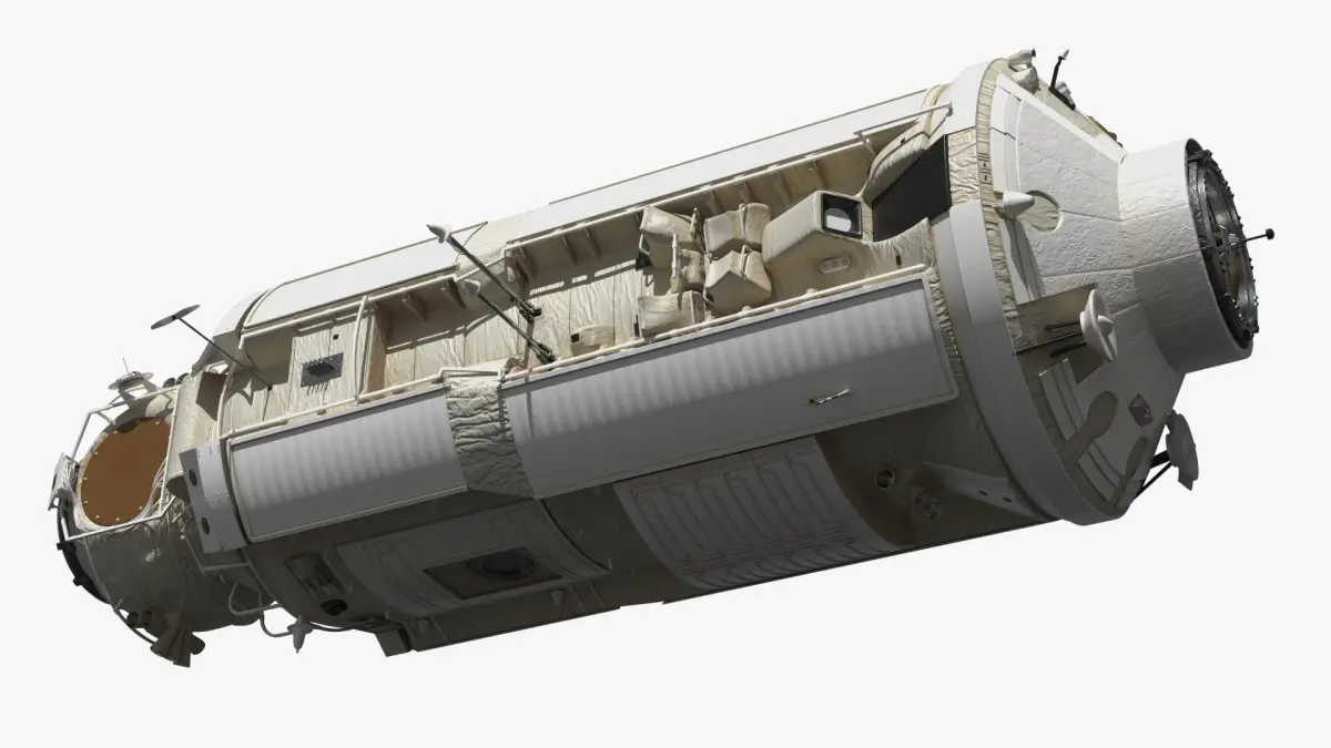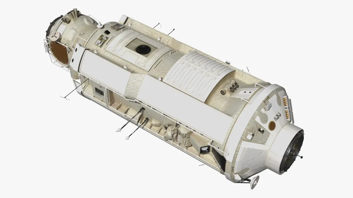 ISS Orbital Cargo Station Module is a 3d model of the International Space Station's (ISS) service module, which provides essential functions like life support, power distribution, and guidance.