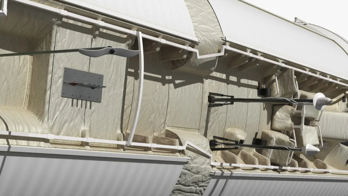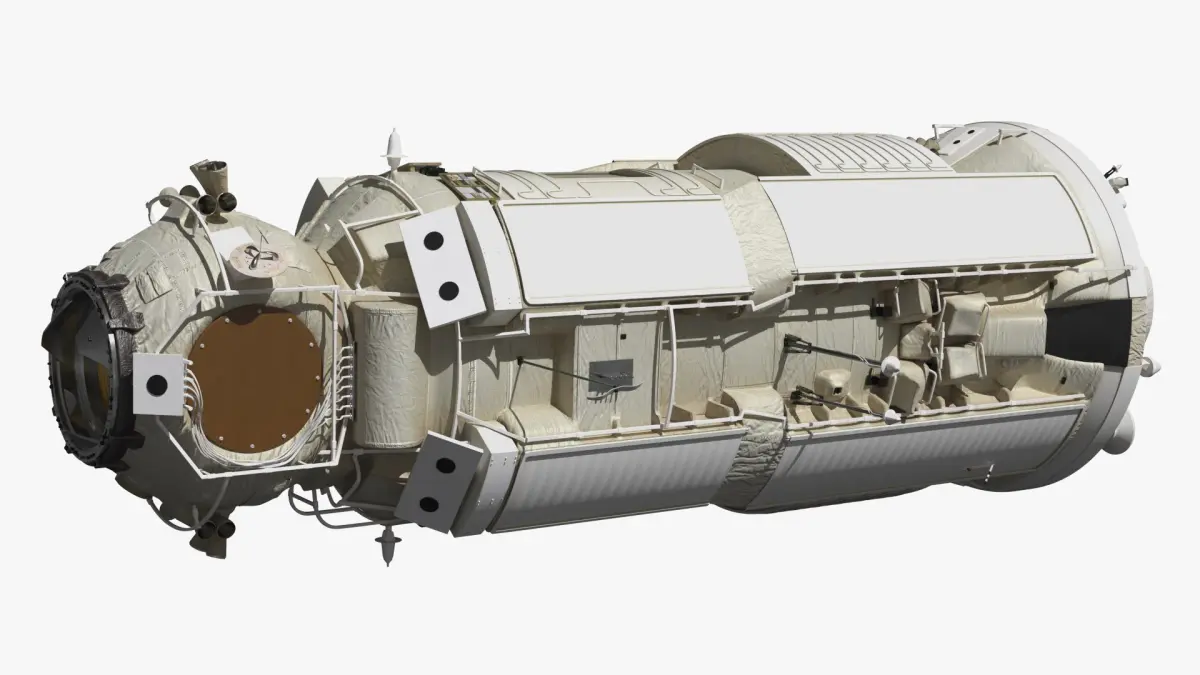 This detailed 3D model showcases the Zvezda Module's design, including its docking ports, solar panels, and thermal insulation. The model accurately represents the intricate structures and external features that contribute to the module's functionality on the ISS, offering an authentic look at this key component of space exploration technology.