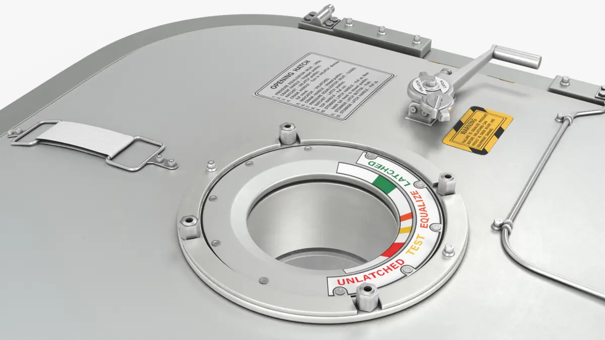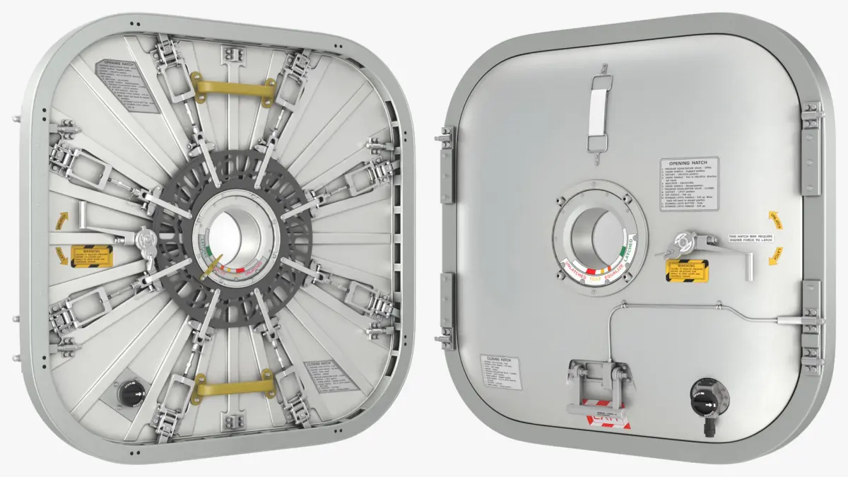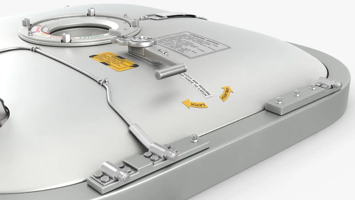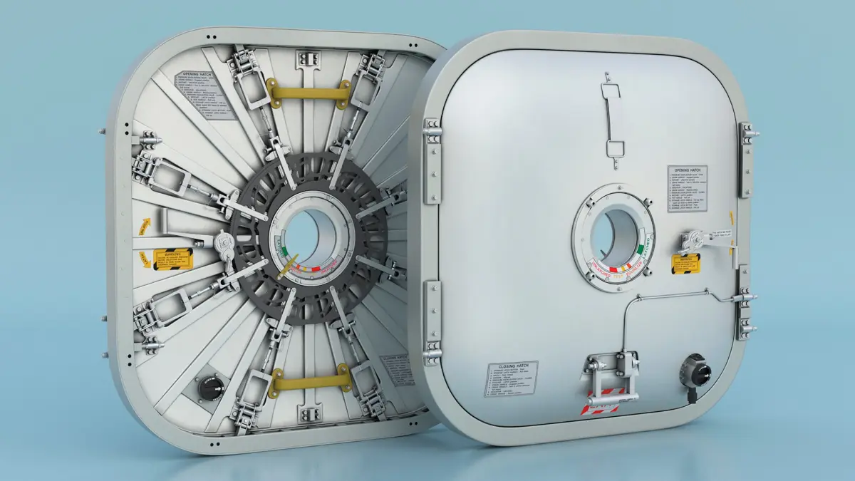 This model features a robust, sealed door mechanism, incorporating multiple latches and sophisticated engineering to withstand the extreme conditions of space. It includes labels and indicators for functionality and safety, ensuring reliable operation. The design focuses on durability, airtight sealing, and ease of use, essential for both astronauts and automated systems.