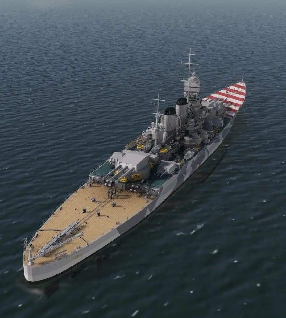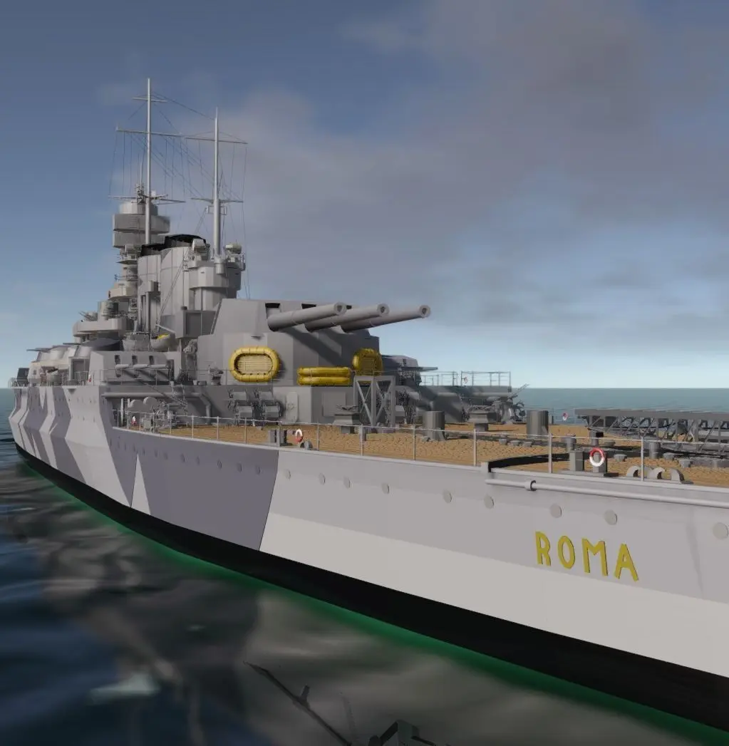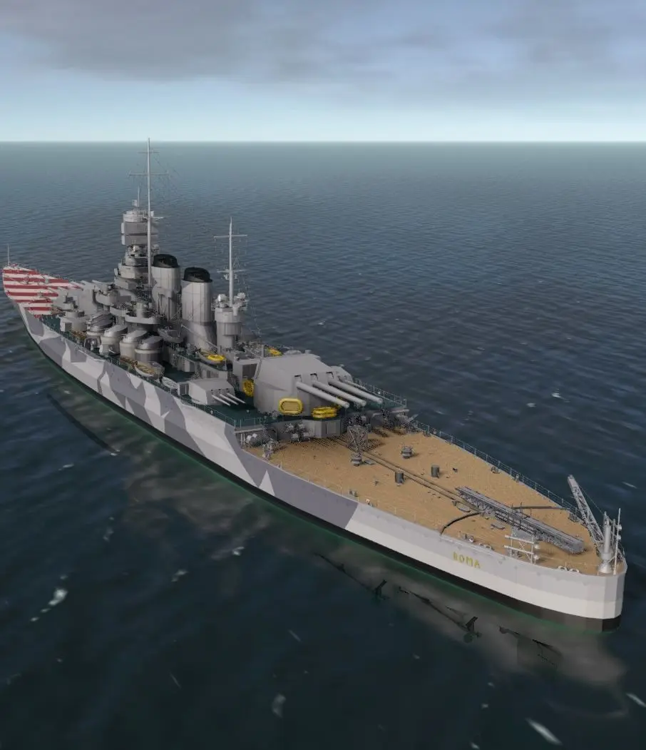 Roma was 144.6 meters (474 ft) long overall and had a beam of 22.4 m (73 ft) and a maximum draft of 8.58 m (28.1 ft). The ship had a slightly inverted bow and a long forecastle deck that extended past the main mast. She displaced 13,772 long tons (13,993 t) at full load. Roma had a crew of 742–764 officers and enlisted men.