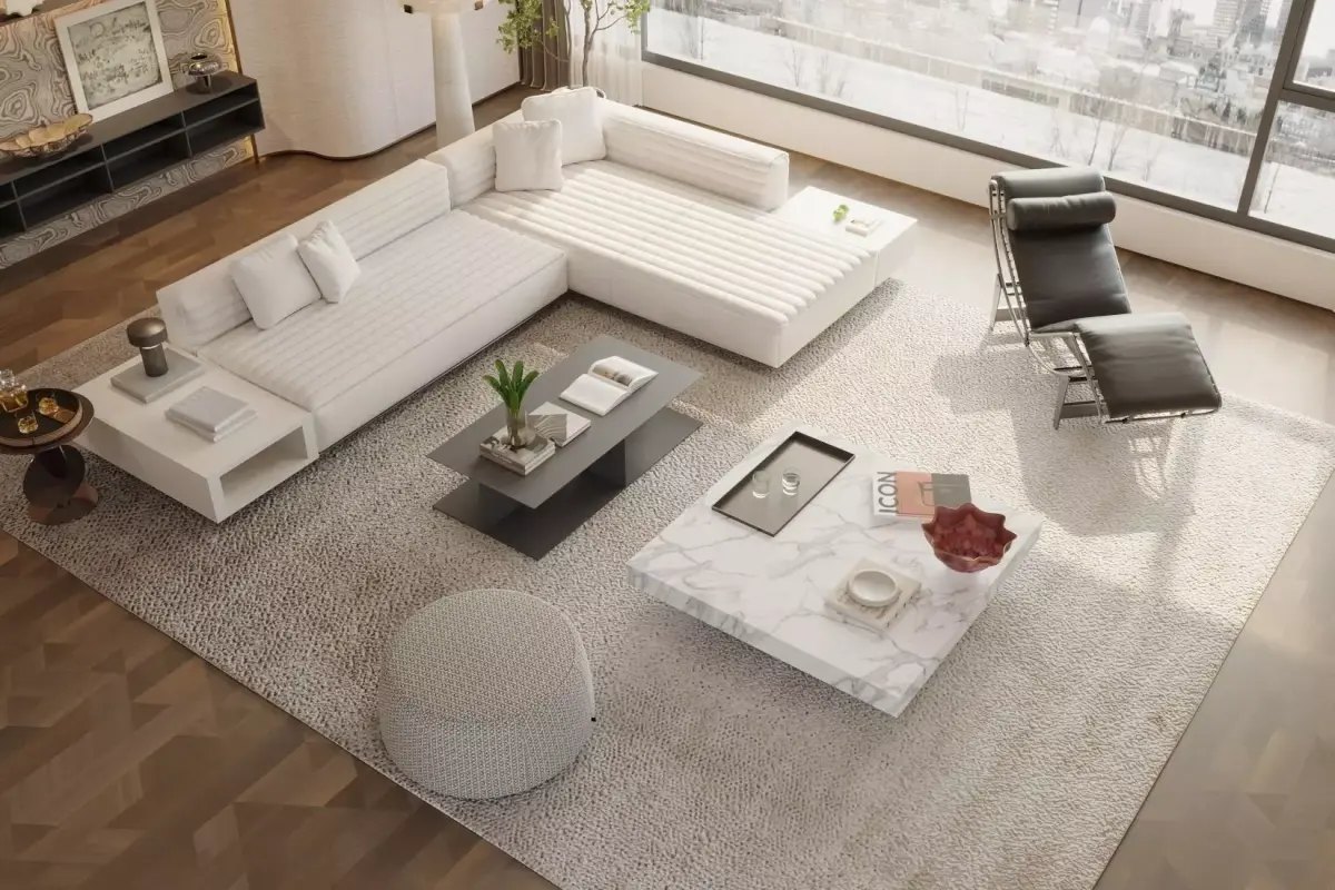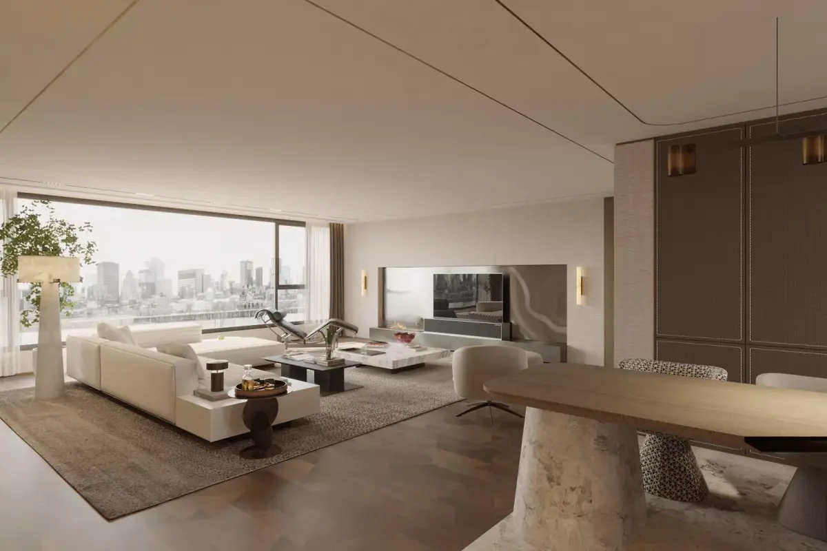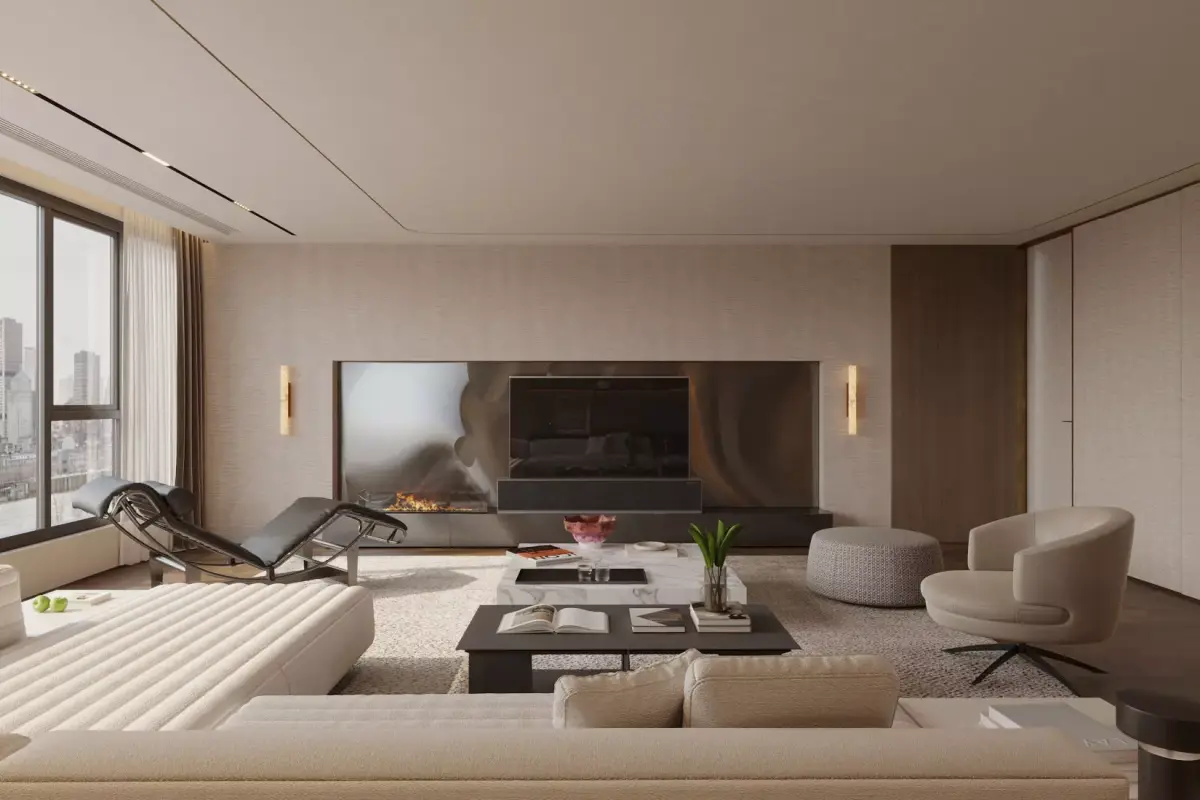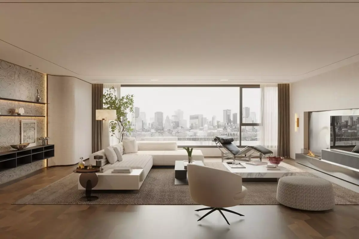 This Italian - style large flat - floor living and dining room is designed to be elegant and grand. In the living room, the beige sofa is matched with a simple coffee table, and the uniquely shaped chair beside it adds personality to the space. The large floor - to - ceiling windows bring in sufficient light and take in the city landscape. The decoration on the wall and the fireplace design enhance the artistic sense and warmth of the space. In the dining area, the marble - textured dining table is matched with chic dining chairs, and the chandelier above creates an exquisite dining atmosphere. The overall space is smooth and natural, combining the romance of Italian style with the comfort of modern life, making it an ideal place for relaxation and dining.