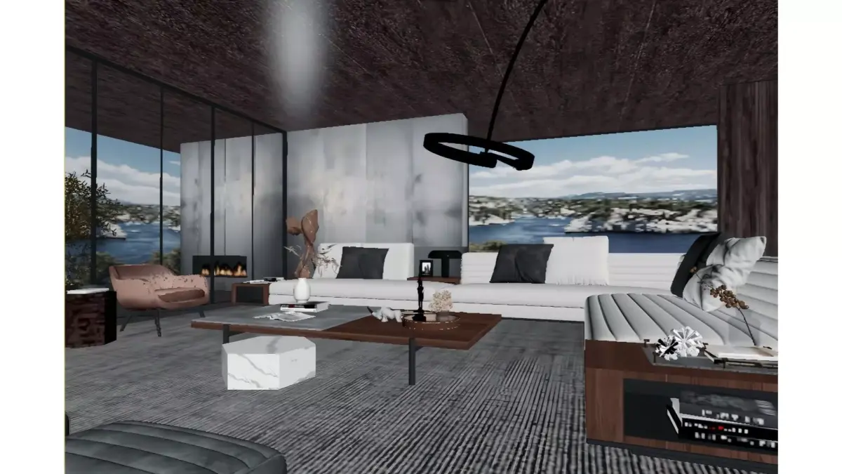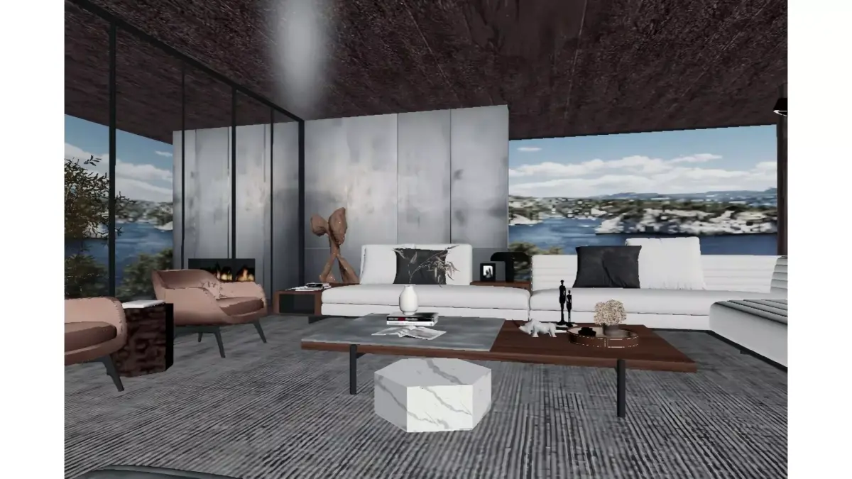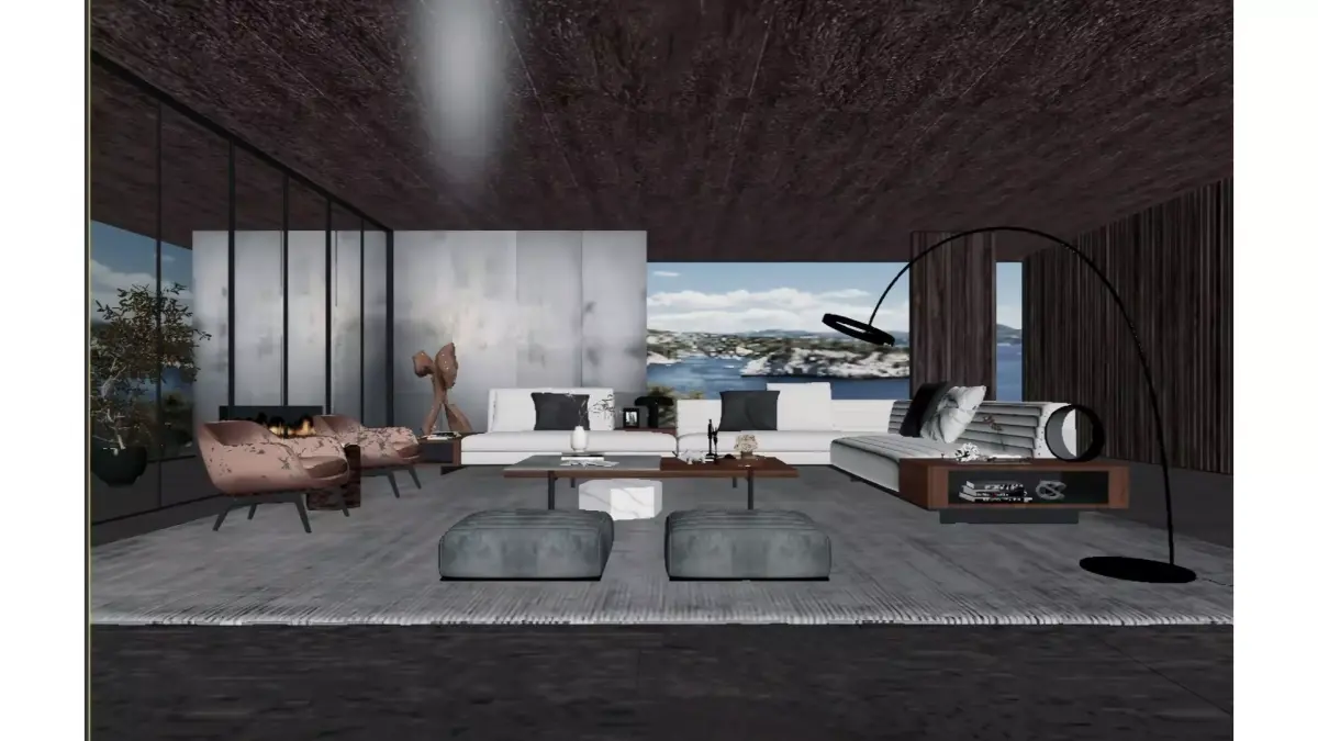 This is a large flat-floor living room space in Italian minimalist style. The dark wooden ceiling and flooring lay a calm and steady tone. It is paired with the classic Roger sofa by Minotti, which features a white main body and black/white throw pillows. For soft furnishings, brown leather single chairs, minimalist metal light fixtures, and artistic sculptures are incorporated. Through the full-panorama floor-to-ceiling windows, the outdoor views of lakes, seas, and mountains are connected. On the whole, it presents a luxury mansion atmosphere of high-end texture + natural relaxation, and serves as a typical case of the combination of modern light luxury home furnishings and landscape views.
