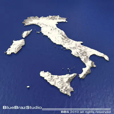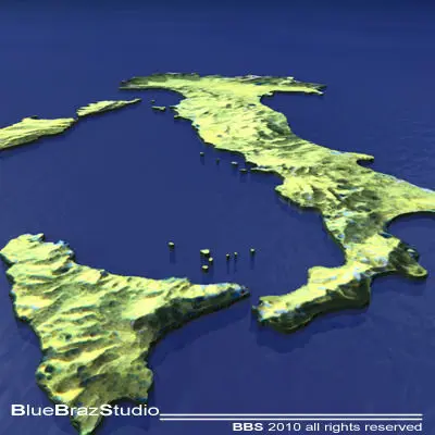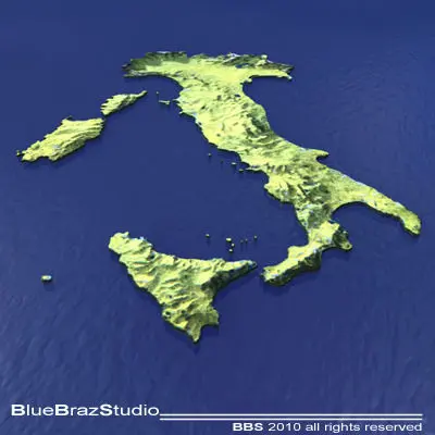 C4D file (obj-dxf-3ds) for a 3D relief map of ItalyAll formats zip files has enclosed tex, material and maps. But it could need some texture reassigning.Polygons 9951Vertices 12643