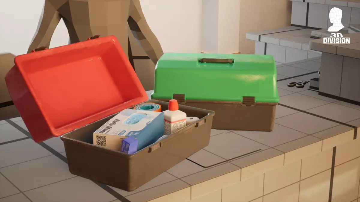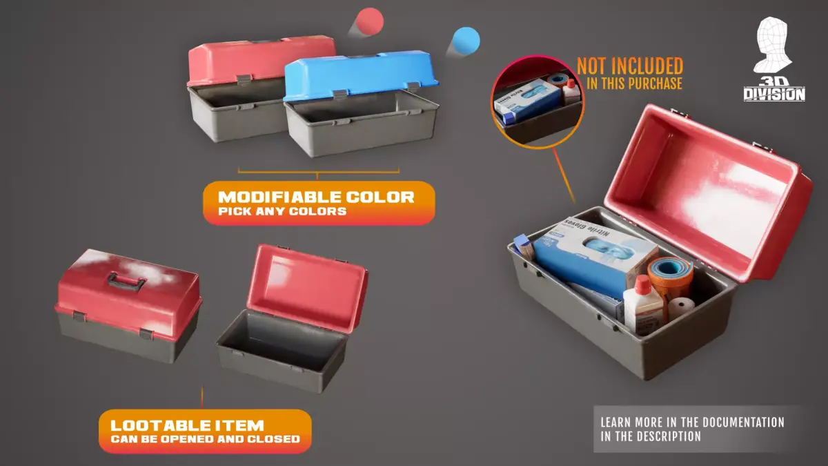 Game-Ready Item Box. Designed for looting mechanics with two distinct mesh states (Open and Closed) and real-time color customization via shader masks.