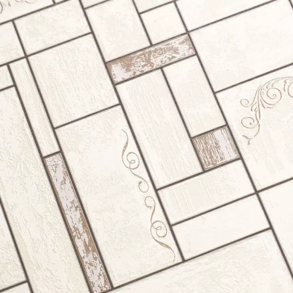 A clean ivory and taupe geometric panel wallpaper composed of interlocking rectangles and slim borders, accented with delicate scroll motifs and light plaster grain for a refined contemporary‑classic look. The warm neutral scheme suits kitchens, dining rooms, and transitional interiors, pairing easily with white cabinetry, stone counters, and natural woods. Package includes 4K+ seamless JPEG and PNG, plus a calibrated grayscale bump/height map derived from the panel relief for gentle shadowing and believable material depth in closeups. Optimized for Blender, 3ds Max, V‑Ray, Corona, Cycles, Unreal/Unity—use as Base Color, set bump 0.15–0.3, and follow included meter‑scale notes for consistent results across engines and large‑format print. The pattern tiles invisibly for full‑wall coverage, enabling fast staging and artifact‑free production renders or printable wall panels.