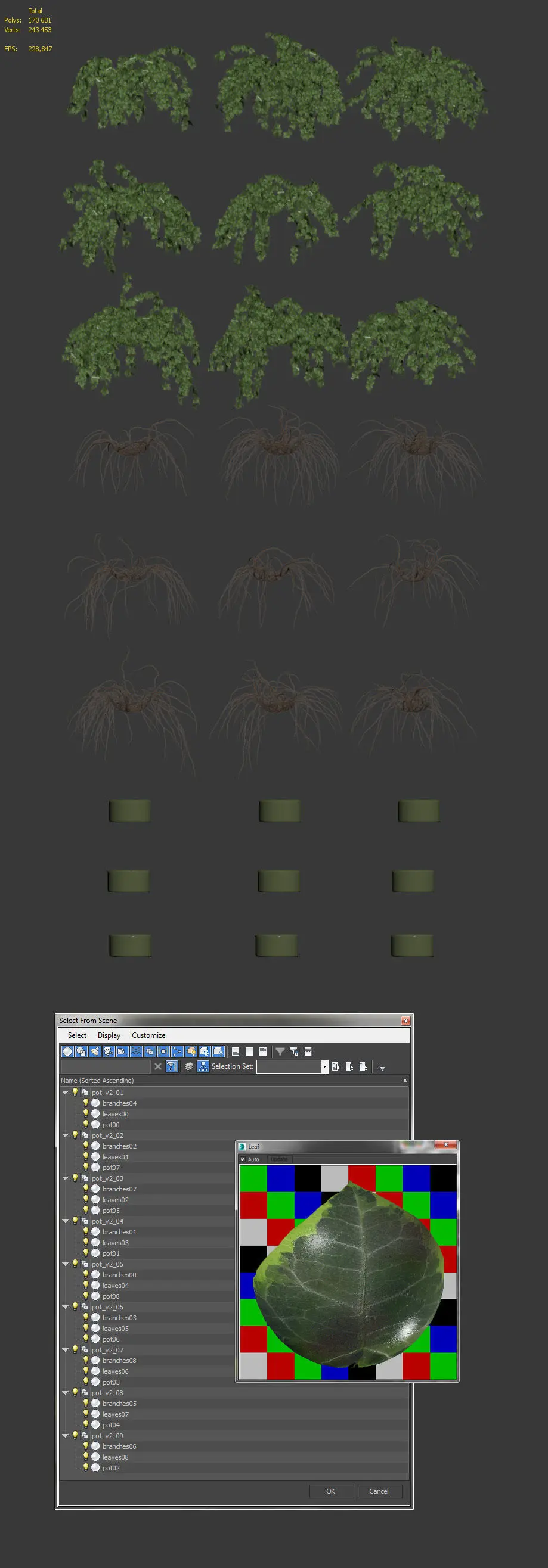 The stem, leaves and pot grouped. Everyone in a separate group. The origin is at the bottom of the pot.