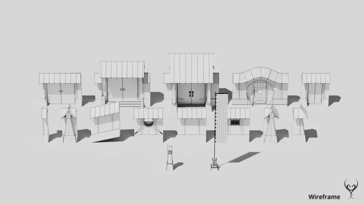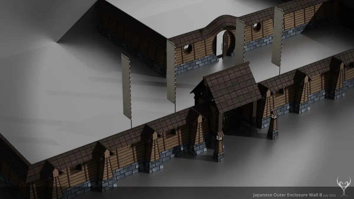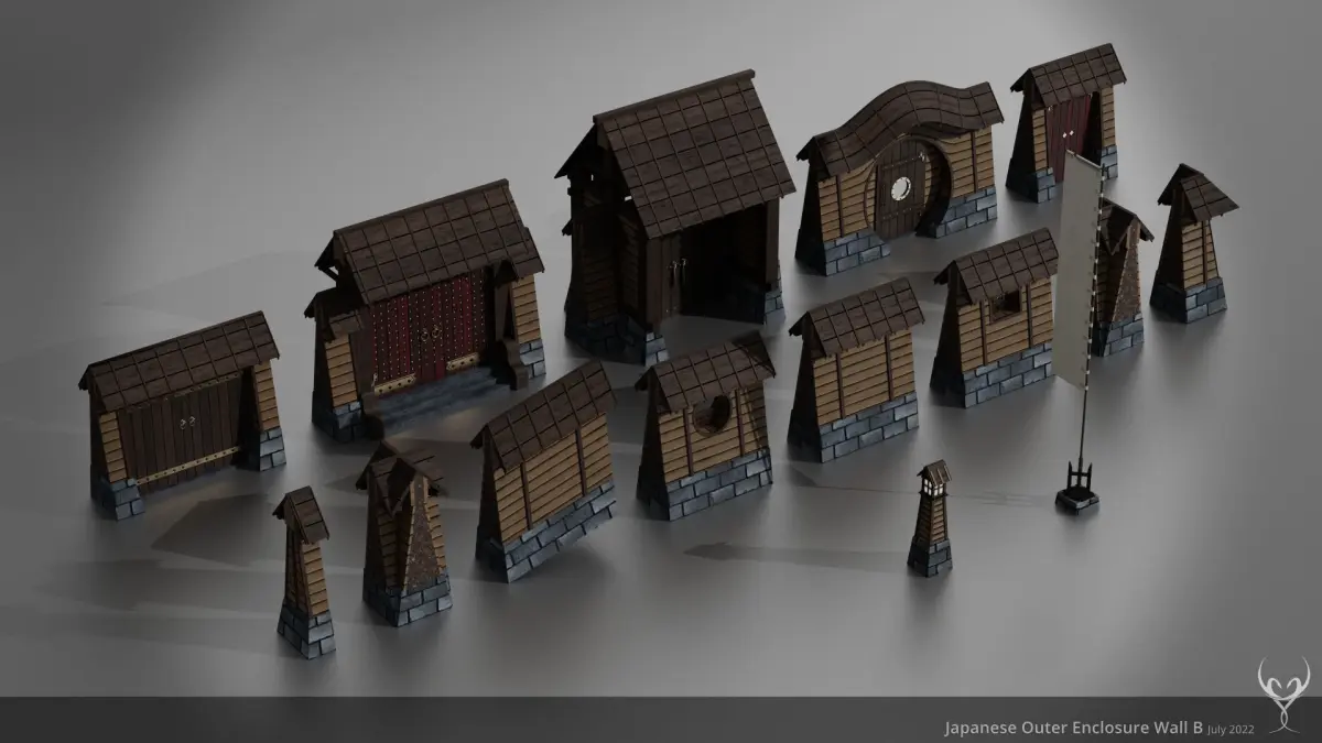 This set contains all pieces to create a modular enclosure wall for different Japanese or asia styled buildings. It contains 30 meshes with full handcrafted LODs (four levels) and is using PBR textures (base color, normal, roughness, metallic, ambient occlusion and emissive). All elements are based on a half by half meter grid system.
