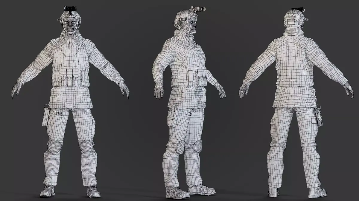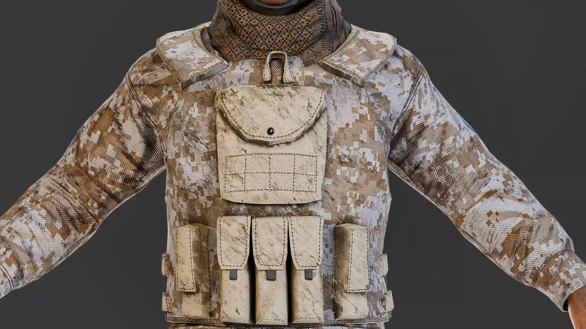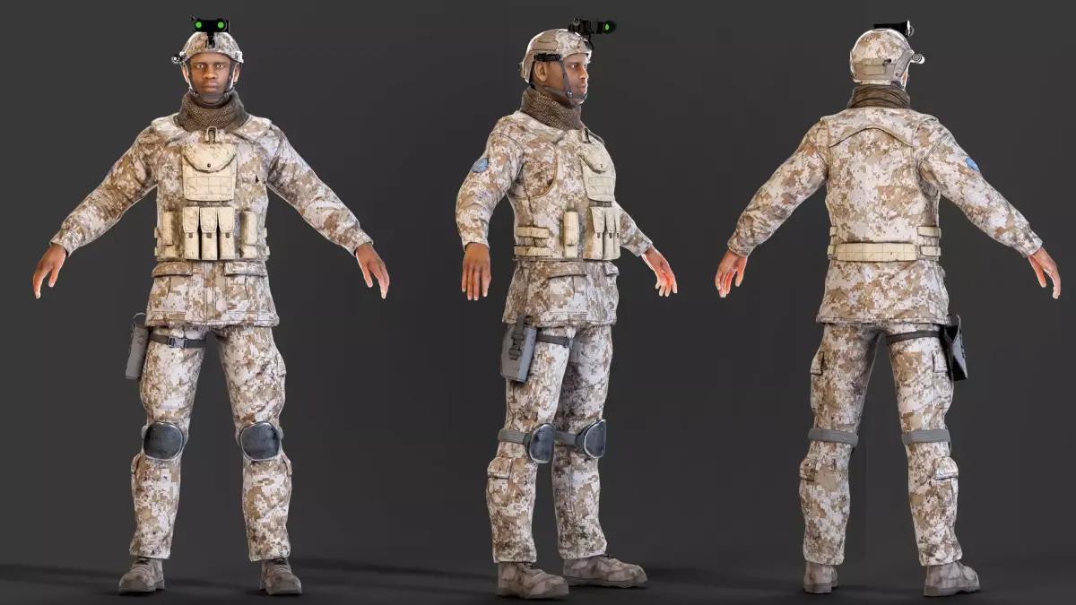 Harry is equipped with a digital camouflage uniform, tactical vest, helmet, pouches, and side gear. All materials are PBR-based, delivering high realism with accurate fabric, metal, and leather details.