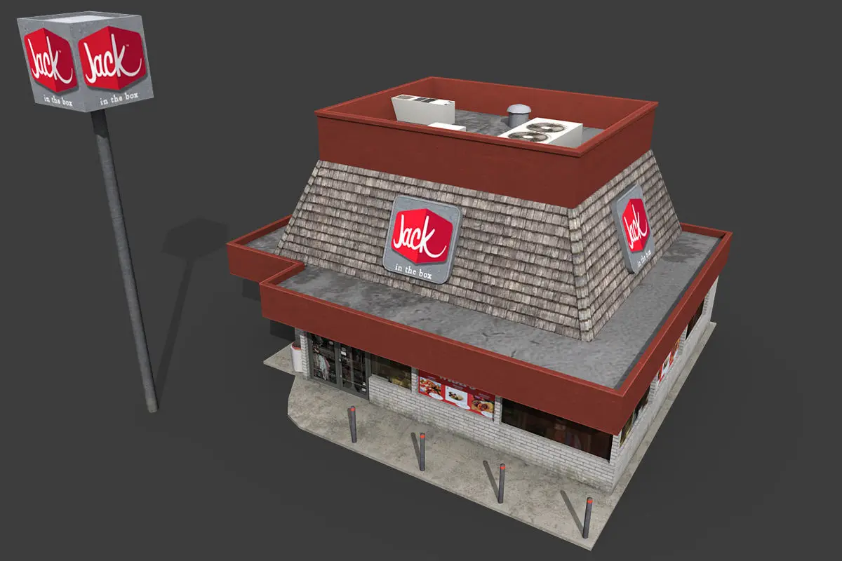 Low poly Jack in the Box restaurant model, ready to use in realtime applications and games.-Ready for use in Unity3d and others game engines.-Source texture in .psd with layers.-Real world size.-No plugins needed for edit and render model in 3ds max 2010 and other 3d modeling software.