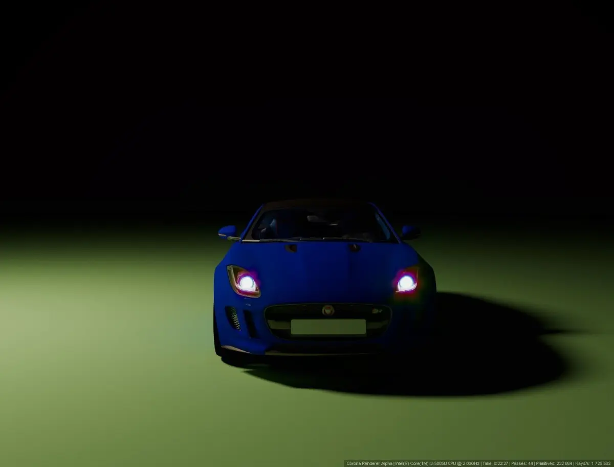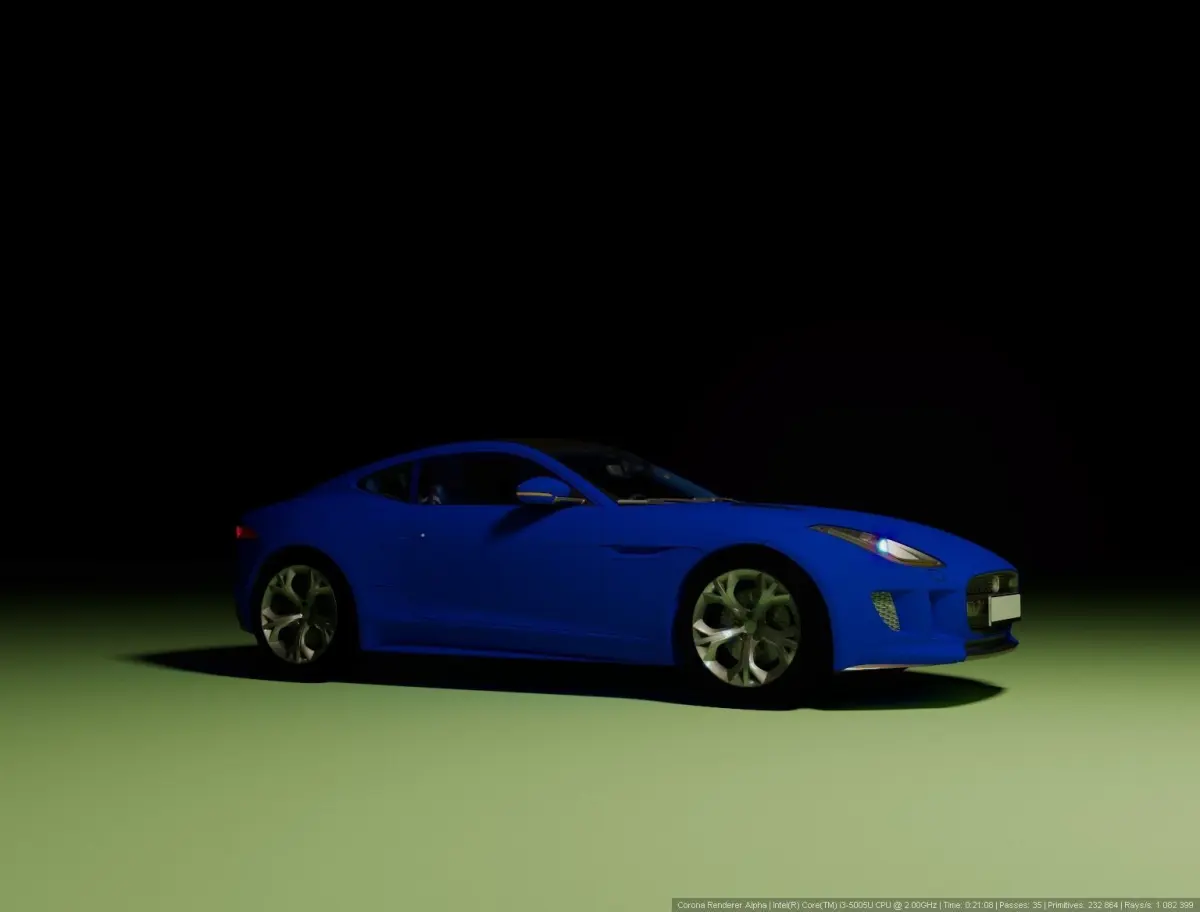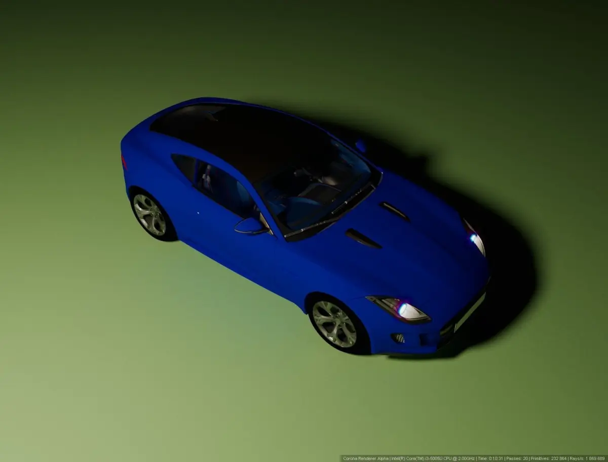 Model with blue version of interior and simple engine. On previev using material pack Corona Render 1.5. Model full with materials, all parts of interior created. On down part of chassis car used black plain. In engine created only upped part.