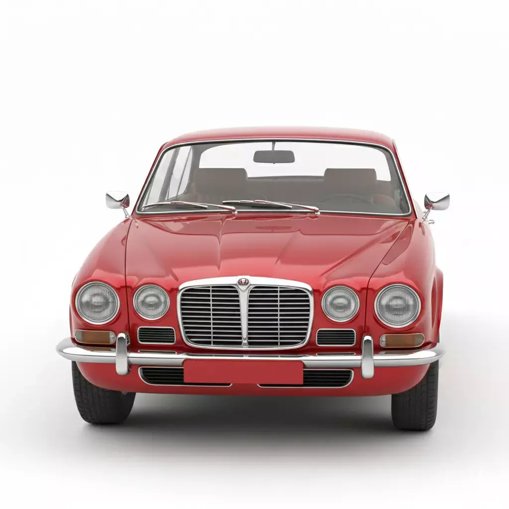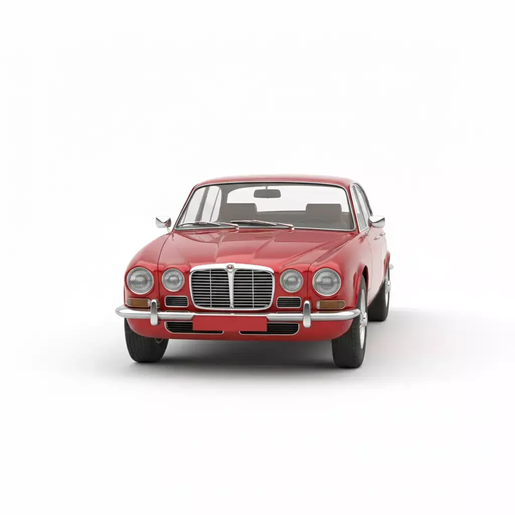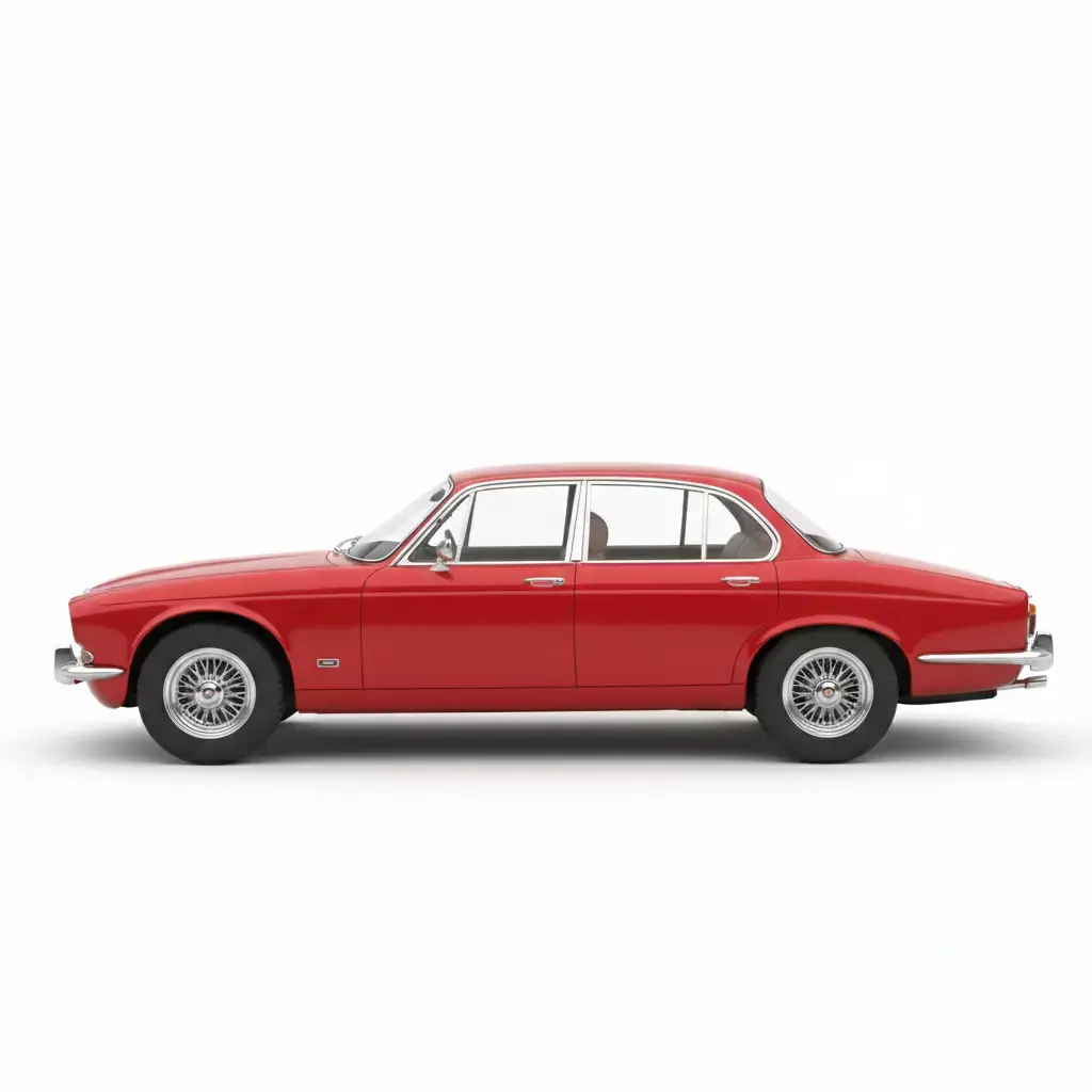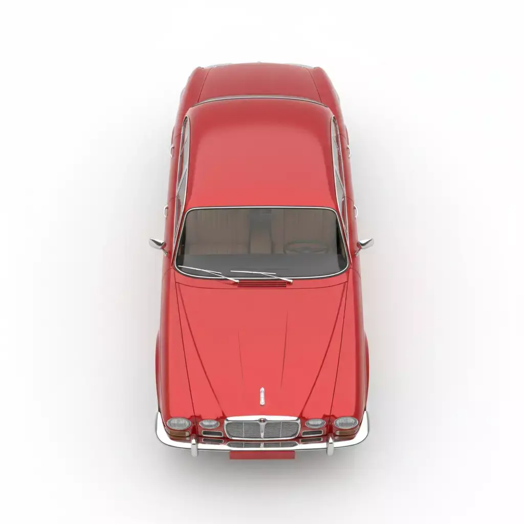 This is a highly detailed 3D model of a classic British luxury sedan, recognizable as a Jaguar XJ Series I or II. The car is finished in a rich, glossy red and features the iconic quad headlamp setup, a vertically ribbed front grille, and abundant chrome trim on the bumper, window surrounds, and side profile, emphasizing its sophisticated and classic styling. The sedan body is characterized by its long bonnet and smooth, elegant lines. This high-fidelity asset is suitable for use in historical visualizations, film, gaming, or any project that needs a touch of mid-century British automotive elegance and luxury.