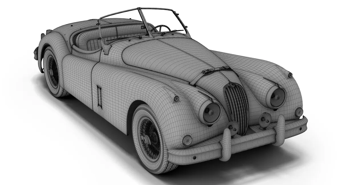 Detailed 3D model of a Jaguar XK140 open two-seater.