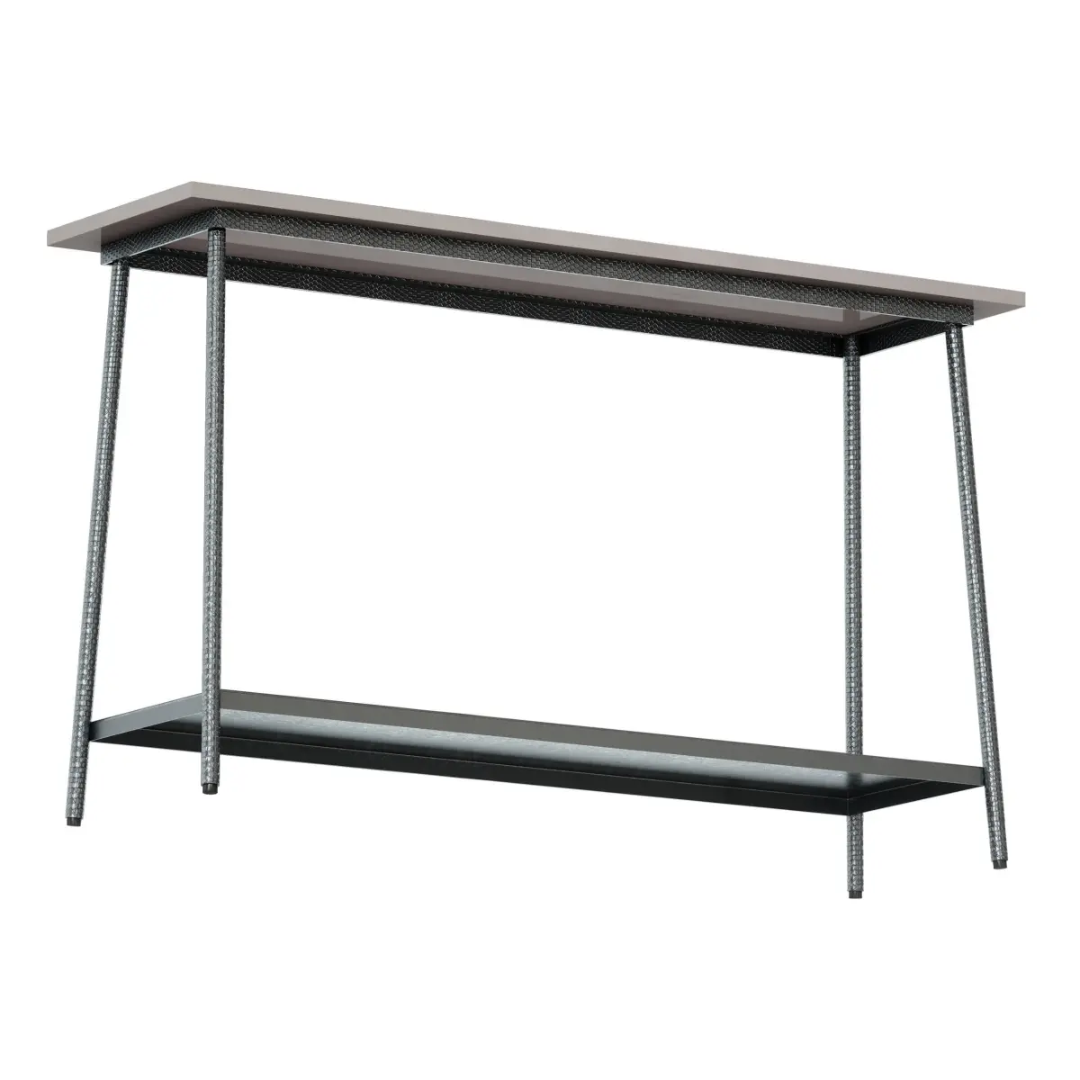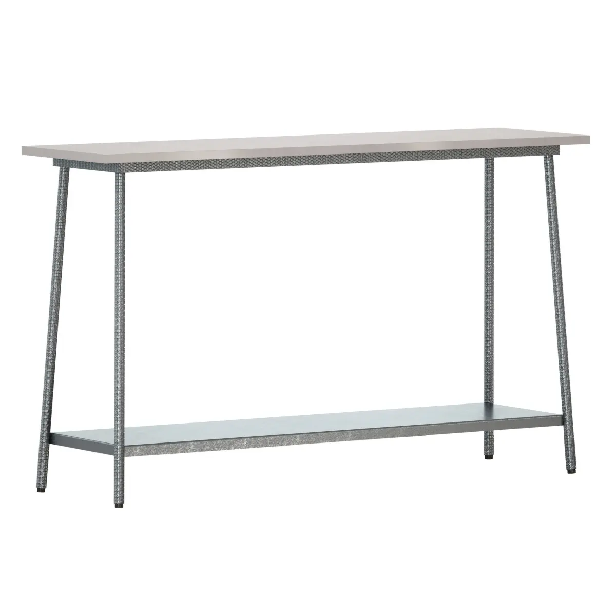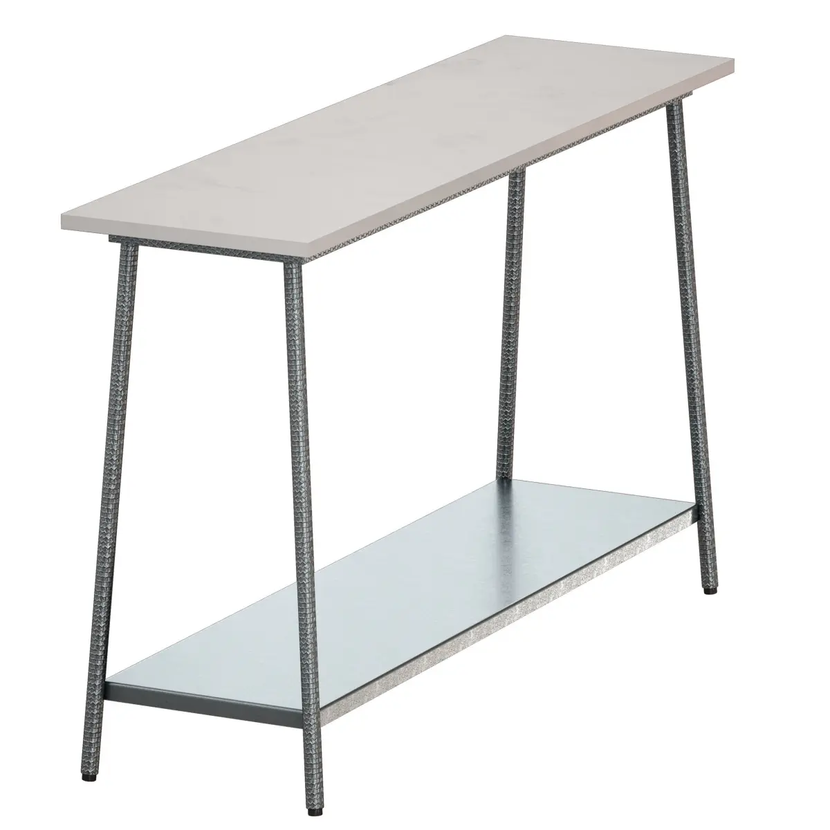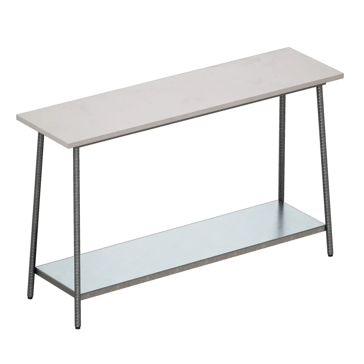 Graphite color metal console table with white marble top. The legs are decorated with a minted texture.