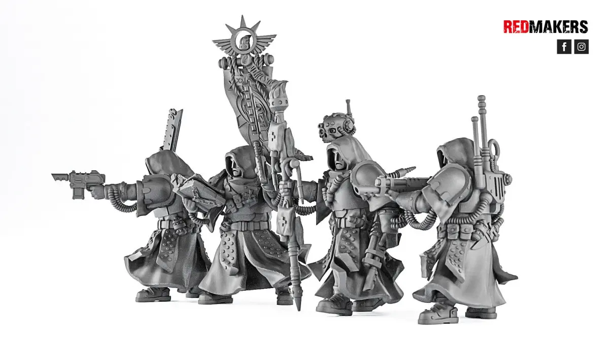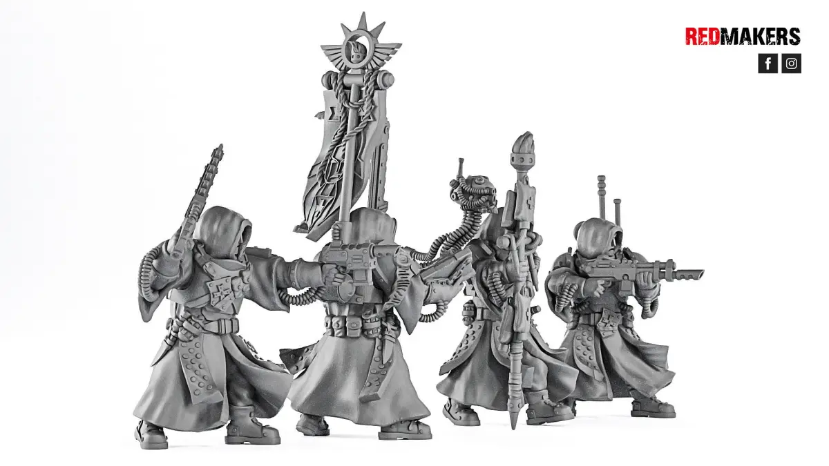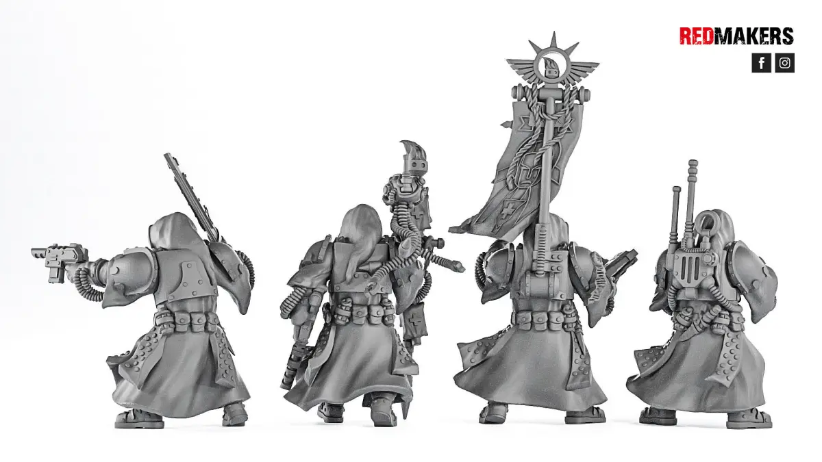 The squad consists of a Commander, a Medic, a Radio-operator and a Guardsman with Banner. Scaled for 28 mm tabletop.