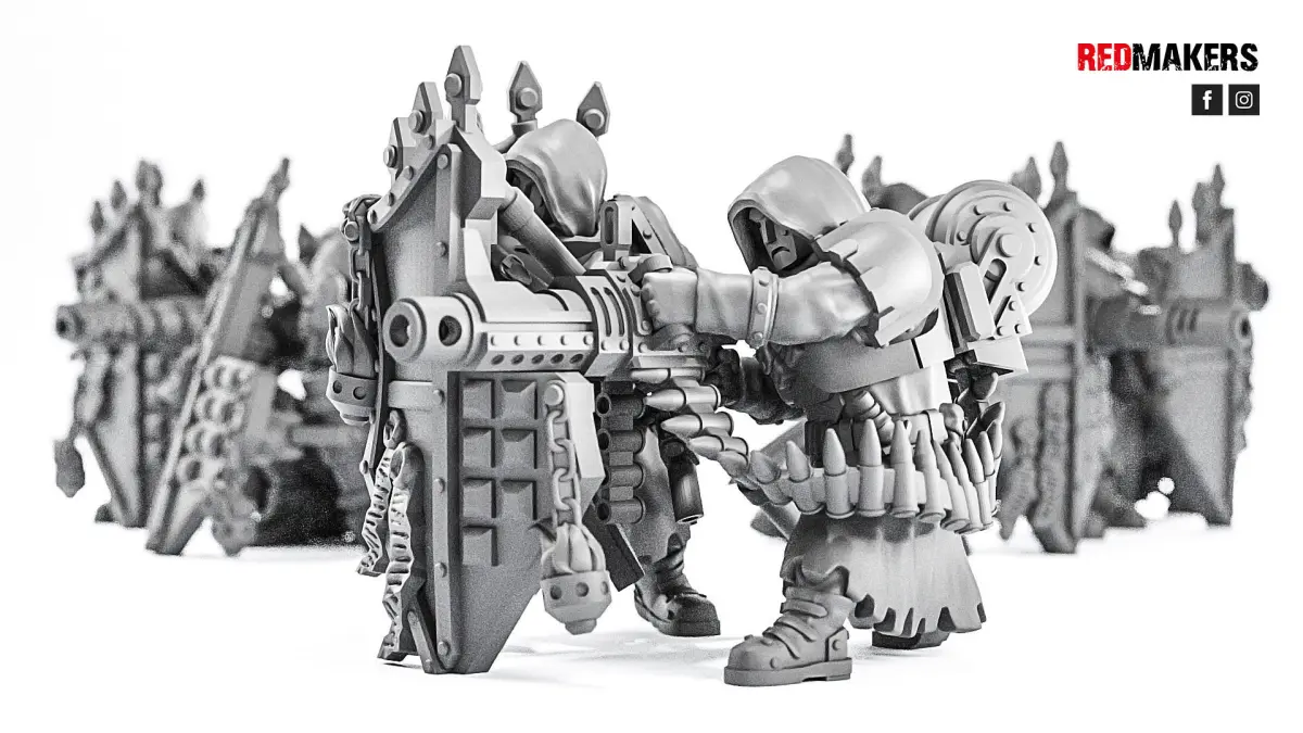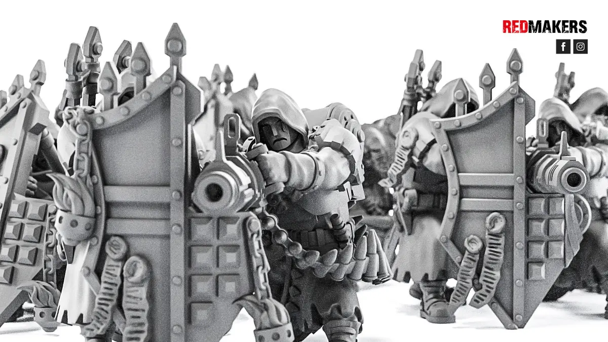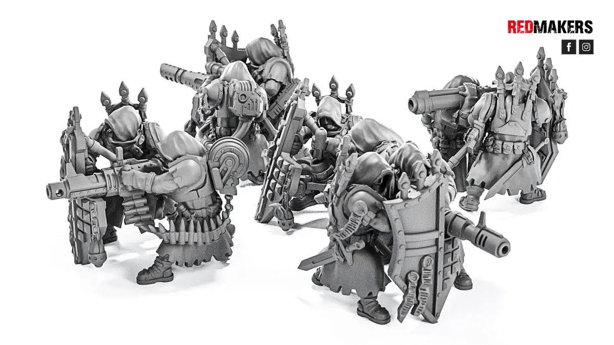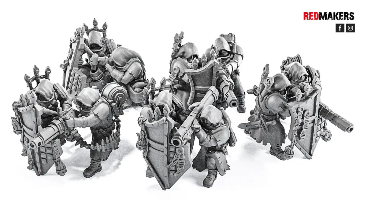 The heavy support squad has five types of heavy weapons. Each shield is unique. Scaled for 28 mm tabletop.